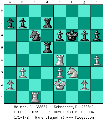 Last move : 1/2-1/2 2021 October 19 22:1:27 [Event "FICGS__CHESS__CUP_CHAMPIONSHIP__000004"] [Site "FICGS"] [Date "2021.09.20"] [Round "1"] [White "Helmer,Janos"] [Black "Schroeder,Christoph"] [Result "1/2-1/2"] [WhiteElo "2268"] [BlackElo "2234"] 1.Nf3 d5 2.d4 c5 3.c4 e6 4.cxd5 exd5 5.Nc3 Nc6 6.dxc5 d4 7.Na4 Bxc5 8.Nxc5 Qa5+ 9.Bd2 Qxc5 10.Rc1 Qb6 11.e3 Nf6 12.Bc4 dxe3 13.Bxe3 Qb4+ 14.Qd2 Qxd2+ 15.Kxd2 Be6 16.Bxe6 fxe6 17.Ke2 Nd5 18.Ng5 Nxe3 19.fxe3 Ke7 20.Rc4 Raf8 21.Rhc1 Rf5 22.Nf3 Rb5 23.b3 Rd8 24.h4 Rd7 25.Rg4 g6 26.Re4 Rbd5 27.Rc2 h6 28.Rc1 Kf6 1/2-1/2 Reti Opening This chess game ended in a draw. Follow this game move after move (download)When your house is on fire, you can't be bothered with the neighbors. Or, as we say in Chess, if your King is under attack you don't worry about losing a Pawn on the Queen's side. (Gary Kasparov) Kritik überlasse ich den Spießern. Ich zeige nichts, wofür ich mich schämen muss. (Alexandra Kosteniuk) El Peón aislado arroja penumbra sobre todo el tablero. (Aaron Nimzovich) En blitz, le Cavalier l'emporte sur le Fou. (Vlastimil Hort) Panic is a sudden desertion of us, an a going over to the enemy of our imagination. (Christian Nevell Bovee)