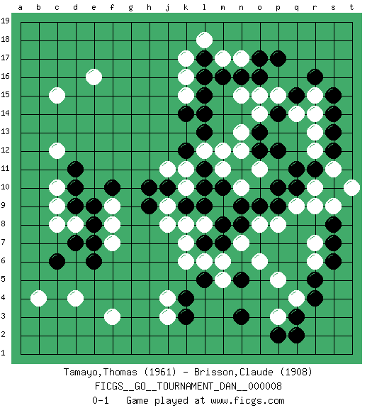 Last move : 0-1 2007 August 30 12:5:58 [Event "FICGS__GO__TOURNAMENT_DAN__000008"] [Site "FICGS"] [Date "2007.07.20"] [Round "1"] [Black "Tamayo,Thomas"] [White "Brisson,Claude"] [Result "0-1"] [Rating 1 "1961"] [Rating 2 "1908"] 1.r16 d4 2.q3 e16 3.p17 r9 4.r5 r12 5.k4 c15 6.c6 c8 7.e6 f3 8.d9 d8 9.e8 c9 10.d10 c10 11.d11 c12 12.d7 b4 13.q10 r10 14.q11 q9 15.p9 p8 16.o9 o8 17.n9 p5 18.s7 r7 19.s8 p3 20.q2 q4 21.r4 k6 22.n3 k17 23.l16 k16 24.l15 k15 25.l14 r6 26.s6 r14 27.r11 s11 28.s10 s9 29.s12 t10 30.s13 j4 31.k3 j3 32.p2 f7 33.e7 m17 34.n16 n17 35.o17 f9 36.e9 f8 37.f10 k10 38.h9 o11 39.p10 r13 40.s14 m11 41.n8 o6 42.k14 l8 43.p12 n13 44.o12 n12 45.l17 l18 46.m16 o14 47.p14 r15 48.s15 p15 49.o13 n15 50.o16 o15 51.m7 m5 52.l7 k7 53.l5 l6 54.n5 n7 55.m8 m6 56.l9 k8 57.k9 j9 58.j10 j8 59.l10 k11 60.l11 l12 61.k12 j11 62.l13 m12 63.h10 m9 64.m10 n10 65.q15 q14 0-1 Here are the names of the openings (joseki) played in the four corners : Corner q4 : q3 r9 Komoku (Somok, Xiao~mu`) 3-4 Point. The komoku (3-4) point is the traditional corner enclosure move.. Corner d4 : d4 c6 Hoshi (Hwajeom, Seongjeom, Xingwei`) 4-4 Point. The star or hoshi (4-4) point, emphasizing influence at the potential expense of territory. Ikken Kakari (Hankan Keolch'im, Yi Gua`jiao~, 1-Space Low Approach). Black 2 is the standard approach move to the 4-4. Player White won this Go (weiqi, baduk) game. Follow this game move after move (download)Fighting must not be the key to go, it should be reserved as your last resource. (Zhong-Pu Liu, about Weiqi) The modern world has divided itself into Conservatives and Progressives. The business of Progressives is to go on making mistakes. The business of the Conservatives is to prevent the mistakes from being corrected. (G.K. Chesterton)