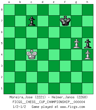 Last move : 1/2-1/2 2021 December 5 22:26:4 [Event "FICGS__CHESS__CUP_CHAMPIONSHIP__000004"] [Site "FICGS"] [Date "2021.09.20"] [Round "1"] [White "Moreira,Jose"] [Black "Helmer,Janos"] [Result "1/2-1/2"] [WhiteElo "2221"] [BlackElo "2268"] 1.d4 d6 2.e4 g6 3.Be3 Bg7 4.Nc3 a6 5.Qd2 b5 6.f3 Nd7 7.h4 Ngf6 8.g4 h5 9.g5 Nh7 10.f4 O-O 11.f5 Nb6 12.Nh3 d5 13.fxg6 fxg6 14.Nf4 dxe4 15.Nxg6 Rf3 16.Be2 Bg4 17.O-O-O Nf8 18.Nf4 Nc4 19.Bxc4+ bxc4 20.Nxe4 Qe8 21.Rhf1 Rd8 22.d5 Qa4 23.Nc3 Qb4 24.a3 Qb7 25.Rxf3 Bxf3 26.Rf1 Rb8 27.b4 cxb3 28.Rxf3 bxc2 29.Qxc2 Bxc3 30.Bc5 Bb2+ 31.Kd1 Be5 32.Qd3 Qb5 33.Qxb5 Rxb5 34.Bxe7 Bxf4 35.Bxf8 Rxd5+ 36.Kc2 Rd4 37.Bc5 Re4 38.Kd3 Ra4 39.Bb4 Bd6 40.Kc4 Bxb4 41.axb4 a5 42.Rb3 Rxb4+ 43.Rxb4 axb4 44.Kxb4 Kf7 45.Kc4 1/2-1/2 Queen's Pawn Kingside Castling by player Black (move 10) Queenside Castling by player White (move 17) 10 pieces endgame at move 41 : White KRPPP , Black KRPPP WHITE : King + 1 Rook 3 Pawns BLACK : King + 1 Rook 3 Pawns 9 pieces endgame at move 42 : White KRPP , Black KRPPP WHITE : King + 1 Rook 2 Pawns BLACK : King + 1 Rook 3 Pawns 8 pieces endgame at move 43 : White KRPP , Black KPPP WHITE : King + 1 Rook 2 Pawns BLACK : King + 3 Pawns 7 pieces endgame at move 43 : White KPP , Black KPPP WHITE : King + 2 Pawns BLACK : King + 3 Pawns 6 pieces endgame at move 44 : White KPP , Black KPP WHITE : King + 2 Pawns BLACK : King + 2 Pawns This chess game ended in a draw. Follow this game move after move (download)The isolated Pawn casts gloom over the entire chessboard. (Aaron Nimzovich) Ich kämpfe solange mein Gegner einen Fehler machen kann. (Emanuel Lasker) Debió haber existido una vez en que los hombres eran semidióses, de otra manera no hubiesen podido inventar el Ajedrez. (Gustav Schenk) Horreur, mais aussi harmonie suprême : qu'y avait-il en effet au monde en dehors des échecs ? Le brouillard, l'inconnu, le non-être... (Vladimir Nabokov) Gambling is the son of avarice and the father of despair. (French proverb)
