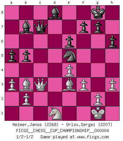 Last move : 1/2-1/2 2021 October 18 10:22:57 [Event "FICGS__CHESS__CUP_CHAMPIONSHIP__000004"] [Site "FICGS"] [Date "2021.09.20"] [Round "1"] [White "Helmer,Janos"] [Black "Orlov,Vladimir"] [Result "1/2-1/2"] [WhiteElo "2268"] [BlackElo "2207"] 1.Nf3 Nf6 2.c4 e6 3.Nc3 d5 4.d4 dxc4 5.e3 a6 6.Bxc4 b5 7.Bb3 Bb7 8.O-O c5 9.Qe2 Nbd7 10.Rd1 Qc7 11.h3 Be7 12.e4 cxd4 13.Nxd4 O-O 14.a3 Rfd8 15.f3 Ne5 16.Be3 Ng6 17.Qf2 Nh5 18.Nde2 Bh4 19.Qf1 Nhf4 20.Nxf4 Nxf4 21.Rxd8+ Rxd8 22.Rd1 h6 23.Rxd8+ Bxd8 24.Qf2 Ng6 25.Qd2 Ne5 26.Nd1 a5 27.Qc3 1/2-1/2 Reti Opening Kingside Castling by player White (move 8) Kingside Castling by player Black (move 13) This chess game ended in a draw. Follow this game move after move (download)It is not a move, even the best move that you must seek, but a realizable plan. (Eugene Znosko-Borovsky) Herr Iljumschinow ist ein etwas merkwürdiger Geschäftsmann: Er arbeitet zusammen mit Leuten wie Muammar al-Gaddafi; früher ist das Saddam Hussein gewesen. (Joel Lautier) Todos los Maestros de Ajedrez fueron un día unos principiantes. (Chernev) L'action d'une oeuvre littéraire se déroule sur un champ de bataille. Les masques et les types du drame moderne correspondent aux pièces du jeu d'échecs. L'intrigue correspond aux coups et aux gambits, c'est à dire aux techniques du jeu telles qu'utilisées et interprétées par les joueurs. Les tactiques et les péripéties [mouvements] correspondent aux coups exécutés par l'adversaire. (Viktor Shklovsky) However beautiful the strategy, you should occasionally look at the results. (Winston Churchill)