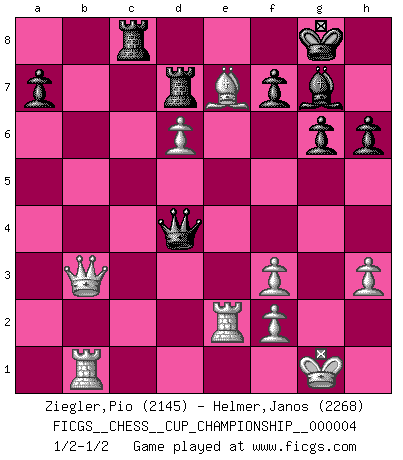 Last move : 1/2-1/2 2021 November 1 3:38:6 [Event "FICGS__CHESS__CUP_CHAMPIONSHIP__000004"] [Site "FICGS"] [Date "2021.09.20"] [Round "1"] [White "Ziegler,Pio"] [Black "Helmer,Janos"] [Result "1/2-1/2"] [WhiteElo "2145"] [BlackElo "2268"] 1.d4 Nf6 2.c4 g6 3.Nc3 d5 4.cxd5 Nxd5 5.e4 Nxc3 6.bxc3 Bg7 7.Nf3 c5 8.Rb1 O-O 9.Be2 cxd4 10.cxd4 Qa5+ 11.Bd2 Qxa2 12.O-O Bg4 13.Be3 Nc6 14.d5 Na5 15.Bg5 Qa3 16.Re1 Rfd8 17.e5 Nc6 18.Rxb7 h6 19.Bh4 Rac8 20.h3 Bxf3 21.Bxf3 Nxe5 22.Bxe7 Nxf3+ 23.gxf3 Qa6 24.Rb3 Rd7 25.d6 Qa2 26.Re2 Qa1 27.Rb1 Qd4 28.Qb3 1/2-1/2 King's Indian defense, 3.Nc3 Kingside Castling by player Black (move 8) Kingside Castling by player White (move 12) This chess game ended in a draw. Follow this game move after move (download)An attack on the wing should be met by play in the center. (Nimzovitch) Der Schachmeister von Heute braucht Courage, einen Killerinstinkt, Ausdauer und Arroganz. (Larry Evans) De todos mis libros Rusos, la defensa contiene y difunde el 'calor' mas grande que pudiese verse extraño al observar lo supremamente abstracto que el Ajedrez supuestamente es. (Vladimir Nabokov) Il a essayé de se convaincre qu'il pourrait empêcher toutes les erreurs et ne jamais perdre. L'horreur ! Gary Kasparov au sujet de Robert Fischer. Every vice is only an exaggeration of a necessary and virtuous function. (Ralph Waldo Emerson, Journals 1936)