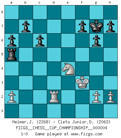 Last move : 1-0 2021 December 9 14:55:31 [Event "FICGS__CHESS__CUP_CHAMPIONSHIP__000004"] [Site "FICGS"] [Date "2021.09.20"] [Round "1"] [White "Helmer,Janos"] [Black "Cleto Junior,Dirceu"] [Result "1-0"] [WhiteElo "2268"] [BlackElo "2063"] 1.Nf3 Nf6 2.c4 g6 3.Nc3 Bg7 4.e4 d6 5.d4 O-O 6.Be2 e5 7.O-O exd4 8.Nxd4 Re8 9.f3 Nc6 10.Be3 Nxd4 11.Bxd4 Be6 12.Qd2 c6 13.Rad1 a6 14.Bf2 Qa5 15.Qxd6 Rad8 16.b4 Rxd6 17.bxa5 Rxd1 18.Rxd1 Ng4 19.Bd4 Ne5 20.Kf2 Bxc4 21.f4 Bxe2 22.Kxe2 Nc4 23.Bxg7 Kxg7 24.e5 Re7 25.Ne4 Nxe5 26.fxe5 Rxe5 27.Kf3 Rxa5 28.Rd2 1-0 Reti Opening Kingside Castling by player Black (move 5) Kingside Castling by player White (move 7) Player White won this chess game. Follow this game move after move (download)Fischer wanted to give the Russians a taste of their own medicine. (Larry Evans) Im Schach gewinnt jeder. Hat man Freunde am Spiel - und das ist die Hauptsache - ist auch der Verlust einer Partie kein Unglück. (David Bronstein) El jugador de combinación piensa hacia adelante; comienza de la posición dada y trabaja las movidas contundentes en su mente. (Emanuel Lasker) La guerre est enfant de la passion, la passion est enfant du narcissisme et le narcissisme est l'enfant. (...) Une autre partie ? (Thibault de Vassal) The real voyage of discovery consists not in seeking new lands but in seeing with new eyes. (Marcel Proust)