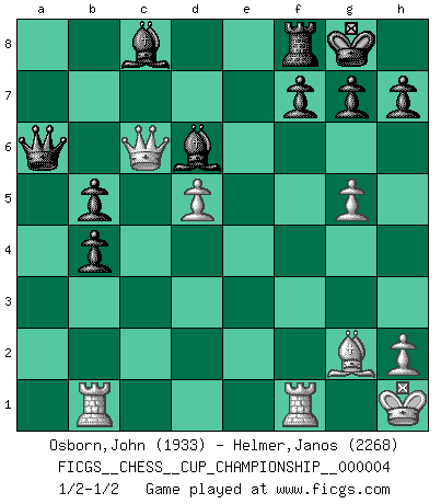 Last move : 1/2-1/2 2021 October 19 3:53:52 [Event "FICGS__CHESS__CUP_CHAMPIONSHIP__000004"] [Site "FICGS"] [Date "2021.09.20"] [Round "1"] [White "Osborn,John"] [Black "Helmer,Janos"] [Result "1/2-1/2"] [WhiteElo "1933"] [BlackElo "2268"] 1.e4 c5 2.Nf3 d6 3.Nc3 Nf6 4.d4 cxd4 5.Nxd4 a6 6.Be2 e5 7.Nb3 Be6 8.f4 Be7 9.O-O Qc7 10.Qd3 b5 11.g4 exf4 12.Bxf4 Nc6 13.g5 Nd7 14.Qg3 O-O 15.Rad1 Rae8 16.Kh1 Nce5 17.Nd4 Qb7 18.a3 Nc5 19.Bxe5 dxe5 20.Qxe5 Bh3 21.Rf3 Bc8 22.b4 Nd7 23.Qg3 Nb6 24.Bf1 Bd8 25.Bg2 Bc7 26.Qh4 Be5 27.Nd5 Nxd5 28.exd5 Qc7 29.Nc6 Bd6 30.a4 Re2 31.Nd4 Rxc2 32.Nxc2 Qxc2 33.R3f1 Qxa4 34.Rb1 a5 35.Qd4 axb4 36.Qb6 Qa6 37.Qc6 Bb7 38.Qd7 Bc8 39.Qc6 Bb7 40.Qd7 Bc8 41.Qc6 1/2-1/2 Sicilian Kingside Castling by player White (move 9) Kingside Castling by player Black (move 14) This chess game ended in a draw. Follow this game move after move (download)Personally, I rather look forward to a computer program winning the world Chess Championship. Humanity needs a lesson in humility. (Richard Dawkings) Im Internet Chess Club betrug mein Rating vorübergehend 3350 ELO-Punkte. (Sergej Karjakin) El Peón aislado arroja penumbra sobre todo el tablero. (Aaron Nimzovich) Les Echecs ont trois composantes : le temps, l'espace et le matériel en dernier. (Mikhail Tal) Wipe them out. All of them. (Darth Sidious in Star Wars ep.1)