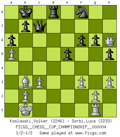 Last move : 1/2-1/2 2021 December 27 15:30:18 [Event "FICGS__CHESS__CUP_CHAMPIONSHIP__000004"] [Site "FICGS"] [Date "2021.09.20"] [Round "1"] [White "Koslowski,Volker"] [Black "Sorbi,Luca"] [Result "1/2-1/2"] [WhiteElo "2246"] [BlackElo "2233"] 1.e4 c5 2.Nf3 d6 3.d4 cxd4 4.Nxd4 Nf6 5.Nc3 a6 6.Be3 e5 7.Nb3 Be6 8.f3 h5 9.Nd5 Bxd5 10.exd5 g6 11.Qd2 Nbd7 12.O-O-O Nb6 13.Kb1 Nbxd5 14.Bg5 Be7 15.Bd3 Qc7 16.Rhe1 Nb6 17.a4 O-O-O 18.a5 Nbd7 19.Be3 Kb8 20.c3 d5 21.Bg1 Rhe8 22.h3 Nc5 23.Bc2 Nxb3 24.Bxb3 Bc5 25.Qg5 Nh7 26.Qh6 Nf8 27.Rxd5 Rxd5 28.Bxd5 Bxg1 29.Rxg1 Rd8 30.Bb3 f6 1/2-1/2 Sicilian : Najdorf, Byrne (English) attack Queenside Castling by player White (move 12) Queenside Castling by player Black (move 17) This chess game ended in a draw. Follow this game move after move (download)No Chess Grandmaster is normal; they only differ in the extent of their madness. (Viktor Korchnoi) Den Ruhm habe ich schon, jetzt brauche ich noch das Geld. (Wilhelm Steinitz) Solo existe una cosa que Fischer hace en el Ajedrez sin placer: ¡perder!. (Boris Spassky) Je fais ceci parce que dans cinquante coups j'obtiendrai cela; je m'appelle Mikhail Moisevitch Botvinnik. (Botvinnik) In fact if nothing is done against this teddy bear, hereby I announce that I would quit chess, rapid chess, blitz chess, postal chess, email chess, server chess and correspondence chess I will then switch to a table game where teddy bears aren't going to be seen for a while, like Poker, or Roulette, all 18+ games. (Elmer Valderrama)