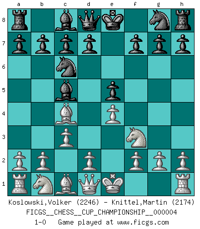 Last move : 1-0 2021 November 29 19:5:21 [Event "FICGS__CHESS__CUP_CHAMPIONSHIP__000004"] [Site "FICGS"] [Date "2021.09.20"] [Round "1"] [White "Koslowski,Volker"] [Black "Knittel,Martin"] [Result "1-0"] [WhiteElo "2246"] [BlackElo "2174"] 1.e4 e5 2.Nf3 Nc6 3.Bc4 Bc5 4.c3 1-0 This chess game has been lost on time (started : 2021.09.20 1:58:51) Giuoco Piano Player White won this chess game. Follow this game move after move (download)Not all artists are Chess players, but all Chess players are artists. (Marcel Duchamp) Das Spiel gibt uns die Genugtuung, die das Leben uns versagt. (Emanuel Lasker) De todos mis libros Rusos, la defensa contiene y difunde el 'calor' mas grande que pudiese verse extraño al observar lo supremamente abstracto que el Ajedrez supuestamente es. (Vladimir Nabokov) Roi des jeux et jeu des rois, les échecs portent en eux un sentiment d'infini. Ils donnent à celui qui s'est efforcé d'en approfondir les arcanes l'impression de n'être pas à la mesure de l'homme; en fait, ils constituent un résumé de l'univers, un microcosme, et figurent cette grande échelle qui, dans les plans de la lumière descend jusqu'à la matière, qui des abîmes insondables remonte jusqu'en l'infini de Dieu. (Pyrame) It is a good thing for an uneducated man to read books of quotations. (Winston Churchill)