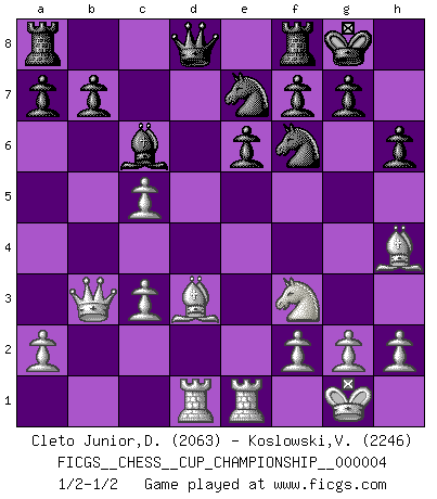 Last move : 1/2-1/2 2021 December 1 14:19:32 [Event "FICGS__CHESS__CUP_CHAMPIONSHIP__000004"] [Site "FICGS"] [Date "2021.09.20"] [Round "1"] [White "Cleto Junior,Dirceu"] [Black "Koslowski,Volker"] [Result "1/2-1/2"] [WhiteElo "2063"] [BlackElo "2246"] 1.d4 Nf6 2.c4 e6 3.Nf3 d5 4.Nc3 dxc4 5.e4 Bb4 6.Bxc4 Nxe4 7.O-O Nf6 8.Qa4+ Nc6 9.Bg5 Bxc3 10.bxc3 h6 11.Bh4 O-O 12.Rfe1 Ne7 13.Bd3 Bd7 14.Qb3 c5 15.dxc5 Bc6 16.Rad1 1/2-1/2 Queen's pawn game Kingside Castling by player White (move 7) Kingside Castling by player Black (move 11) This chess game ended in a draw. Follow this game move after move (download)Chess is the gymnasium of the mind. (Blaise Pascal) Gott hat gewollt, dass ich Champion werde. (Surab Azmajparaschvili) Alekhine es un poeta que crea un trabajo de arte de algo que raramente inspiraría a otra persona a mandar una tarjeta postal. (Max Euwe) Il s'avisa de me proposer d'apprendre les échecs qu'il jouait un peu... me voilà forcené des échecs. J'achète un échiquier, je m'enferme dans ma chambre, j'y passe des jours et des nuits à vouloir apprendre par cur toutes les parties. (Jean-Jacques Rousseau, Confessions) May I never be complete. May I never be content. May I never be perfect. Deliver me, Tyler, from being perfect and complete. (Chuck Palahniuk, Fight Club)