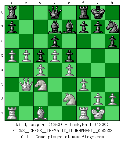 Last move : 0-1 2006 September 7 14:14:18 [Event "FICGS__CHESS__THEMATIC_TOURNAMENT__000003"] [Site "FICGS"] [Date "2006.06.24"] [Round "1"] [White "Wild,Jacques"] [Black "Cook,Phil"] [Result "0-1"] [WhiteElo "1360"] [BlackElo "1200"] 1.d4 Nf6 2.c4 c5 3.d5 b5 4.cxb5 d6 5.f3 e5 6.e4 Be7 7.Nc3 O-O 8.Bc4 Qe8 9.Nge2 Nbd7 10.O-O Nb6 11.b3 Nxc4 12.bxc4 h6 13.Qb3 Qd8 14.a4 Nh7 15.a5 Bd7 0-1 Benko gambit Kingside Castling by player Black (move 7) Kingside Castling by player White (move 10) Player Black won this chess game. Follow this game move after move (download)If I win a tournament, I win it by myself. I do the playing. Nobody helps me. (Bobby Fischer) Wenn ich einen Club besuche, sind die Spieler stumm vor Staunen. (José Raúl Capablanca) Nos gusta pensar. (Gary Kasparov) Le joueur d'Echecs qui veut atteindre le top est obligé de développer son propre credo créatif. Alexeï Stepanovicth Souétine. Il est facile d'écrire des livres ! Ce qui est difficile, c'est de jouer ! (Alexeï Stepanovicth Souétine) Just because you do not take an interest in politics doesn't mean politics won't take an interest in you. (Pericles 430 B.C.)