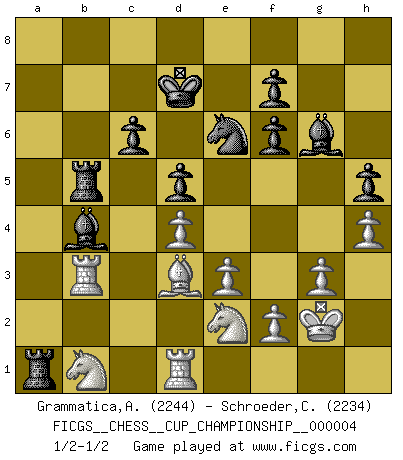 Last move : 1/2-1/2 2021 October 22 15:4:33 [Event "FICGS__CHESS__CUP_CHAMPIONSHIP__000004"] [Site "FICGS"] [Date "2021.09.20"] [Round "1"] [White "Grammatica,Andrea"] [Black "Schroeder,Christoph"] [Result "1/2-1/2"] [WhiteElo "2244"] [BlackElo "2234"] 1.d4 d5 2.c4 e6 3.Nc3 Nf6 4.cxd5 exd5 5.Bg5 c6 6.e3 Bf5 7.Qf3 Bg6 8.Bxf6 Qxf6 9.Qxf6 gxf6 10.h4 h5 11.Nh3 Bd6 12.Kd2 Nd7 13.Bd3 Nf8 14.g3 Ne6 15.Rhd1 a5 16.Rac1 a4 17.Ke2 Kd7 18.Kf3 Rhe8 19.Ng1 Ra5 20.Nge2 b5 21.a3 b4 22.axb4 Bxb4 23.Ra1 Rea8 24.Nb1 a3 25.Ra2 axb2 26.Rxb2 Rb5 27.Rb3 Ra1 28.Kg2 1/2-1/2 QGD : Exchange, positional line, 5...c6 This chess game ended in a draw. Follow this game move after move (download)There is no remorse like the remorse of Chess. (H. G. Wells) Ich hatte Angst gegen einen russischen Großmeister zu verlieren, und er befürchtete gegen einen kleinen Jungen zu verlieren. (über ein Remis gegen Juri Awerbach). (Robert James Fischer) Solo existe una cosa que Fischer hace en el Ajedrez sin placer: ¡perder!. (Boris Spassky) Il n'y a pas de prix trop élevé au scalp de l'ennemi. (Koblentz) When I took office, only high energy physicists had ever heard of what is called the World Wide Web... Now even my cat has its own page. (Bill Clinton, 1996)