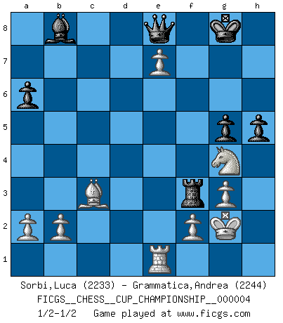 Last move : 1/2-1/2 2021 December 9 17:21:56 [Event "FICGS__CHESS__CUP_CHAMPIONSHIP__000004"] [Site "FICGS"] [Date "2021.09.20"] [Round "1"] [White "Sorbi,Luca"] [Black "Grammatica,Andrea"] [Result "1/2-1/2"] [WhiteElo "2233"] [BlackElo "2244"] 1.e4 e5 2.Nf3 Nc6 3.Bb5 a6 4.Ba4 Nf6 5.O-O Be7 6.Re1 b5 7.Bb3 O-O 8.c3 d5 9.exd5 Nxd5 10.Nxe5 Nxe5 11.Rxe5 c6 12.Re1 Bd6 13.d4 Qh4 14.g3 Qh3 15.Re4 g5 16.Qf1 Qh5 17.Nd2 f5 18.Bd1 Qh6 19.Re1 f4 20.Ne4 Bc7 21.c4 Bh3 22.Qe2 bxc4 23.Bd2 Bf5 24.Qxc4 Kh8 25.Nc3 Nb6 26.Qe2 Bg6 27.Bb3 Nd7 28.Rac1 Nf6 29.Be6 Rad8 30.Qc4 Bb8 31.Qc5 Bh5 32.Qxc6 fxg3 33.hxg3 Ng4 34.Nd1 Ne5 35.dxe5 Bf3 36.Qxf3 Rxf3 37.Ba5 R8d3 38.Rc8+ Rf8 39.Bf5 Rf3 40.Rxf8+ Qxf8 41.e6 Rxf5 42.e7 Qe8 43.Bc3+ Kg8 44.Ne3 Rf3 45.Ng4 h6 46.Kg2 h5 1/2-1/2 Ruy Lopez : Closed, 7...O-O Kingside Castling by player White (move 5) Kingside Castling by player Black (move 7) This chess game ended in a draw. Follow this game move after move (download)During a Chess competition a Chessmaster should be a combination of a beast of prey and a monk. (Alexander Alekhine) Offensichtlich kennt Kasparow nichts anderes als Schach, und ich könnte 500 weitere Spieler dieser Sorte benennen. (Judith Polgar) Fischer deseaba darle a los Rusos una sopa de su propia medicina. (Larry Evans) Les Echecs représentent une sphère d'idées créatrices basée sur la volonté des deux protagonistes. (Smyslov) It is not true that people stop pursuing dreams because they grow old, they grow old because they stop pursuing dreams. (Gabriel Garcia Marquez)