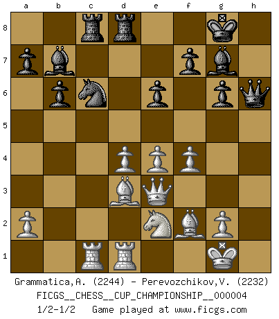 Last move : 1/2-1/2 2021 October 10 19:38:46 [Event "FICGS__CHESS__CUP_CHAMPIONSHIP__000004"] [Site "FICGS"] [Date "2021.09.20"] [Round "1"] [White "Grammatica,Andrea"] [Black "Perevozchikov,Vjacheslav"] [Result "1/2-1/2"] [WhiteElo "2244"] [BlackElo "2232"] 1.d4 Nf6 2.c4 g6 3.Nc3 d5 4.cxd5 Nxd5 5.e4 Nxc3 6.bxc3 Bg7 7.Bc4 c5 8.Ne2 Nc6 9.Be3 O-O 10.O-O b6 11.h4 e6 12.h5 Qh4 13.hxg6 hxg6 14.f3 cxd4 15.cxd4 Rd8 16.Qd2 Bb7 17.Rac1 Bf6 18.Bf2 Qh5 19.Rfd1 Be5 20.f4 Bg7 21.Qe3 Rac8 22.Ng3 Qh6 23.Ne2 Na5 24.Bd3 Nc6 1/2-1/2 King's Indian defense, 3.Nc3 Kingside Castling by player Black (move 9) Kingside Castling by player White (move 10) This chess game ended in a draw. Follow this game move after move (download)Your body has to be in top condition. Your Chess deteriorates as your body does. You can't separate body from mind. (Bobby Fischer) Es gibt keine einzige Frau, der ich nicht einen Springer vorgeben könnte und trotzdem gewänne. (Robert James Fischer) El Ajedrez es una hermosa aventura. (Bent Larsen) Les Cavaliers se révèlent fort utiles dans les positions fermées. D'habitude, les Fous sont un peu plus forts que les Cavaliers dans les positions ouvertes. Qu'on le veuille ou non, il restera toujours des exceptions ! Luck never made a man wise. (Seneca, Letters to Lucilius)