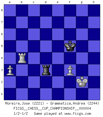 Last move : 1/2-1/2 2021 October 4 21:9:47 [Event "FICGS__CHESS__CUP_CHAMPIONSHIP__000004"] [Site "FICGS"] [Date "2021.09.20"] [Round "1"] [White "Moreira,Jose"] [Black "Grammatica,Andrea"] [Result "1/2-1/2"] [WhiteElo "2221"] [BlackElo "2244"] 1.c4 e5 2.Nc3 Bb4 3.Nd5 Bc5 4.e3 Nf6 5.b4 Be7 6.Nxe7 Qxe7 7.Bb2 O-O 8.Ne2 d5 9.cxd5 Nxd5 10.a3 c6 11.Ng3 a5 12.b5 Rd8 13.Qh5 Nd7 14.Rc1 Re8 15.Bd3 N7f6 16.Qe2 cxb5 17.Bxb5 Bg4 18.f3 Bd7 19.O-O Rad8 20.Rfd1 Qd6 21.Bxd7 Qxd7 22.Qf1 h5 23.h4 Qa4 24.Rc4 Qd7 25.Rdc1 a4 26.e4 b5 27.Rc5 Nf4 28.R1c2 Qa7 29.Qxb5 Nd3 30.Qa5 Qxa5 31.Rxa5 Ne1 32.Rc7 Nxg2 33.Bxe5 Nxh4 34.Bxf6 gxf6 35.Nxh5 Rxd2 36.Nxf6+ Kf8 37.Kf1 Re6 38.Ra8+ Kg7 39.Nh5+ Kh7 40.Rxf7+ Kg6 41.Rf5 Nxf5 42.exf5+ Kxf5 43.Ng7+ Kf6 44.Nxe6 Kxe6 45.Rxa4 Kf5 46.Rb4 Rd3 47.Kg2 1/2-1/2 English, Kramnik-Shirov counterattack Kingside Castling by player Black (move 7) Kingside Castling by player White (move 19) 10 pieces endgame at move 42 : White KRNPPP , Black KRRP WHITE : King + 1 Rook 1 Knight 3 Pawns BLACK : King + 2 Rooks 1 Pawn 9 pieces endgame at move 42 : White KRNPP , Black KRRP WHITE : King + 1 Rook 1 Knight 2 Pawns BLACK : King + 2 Rooks 1 Pawn 8 pieces endgame at move 44 : White KRNPP , Black KRP WHITE : King + 1 Rook 1 Knight 2 Pawns BLACK : King + 1 Rook 1 Pawn 7 pieces endgame at move 44 : White KRPP , Black KRP WHITE : King + 1 Rook 2 Pawns BLACK : King + 1 Rook 1 Pawn 6 pieces endgame at move 45 : White KRPP , Black KR WHITE : King + 1 Rook 2 Pawns BLACK : King + 1 Rook This chess game ended in a draw. Follow this game move after move (download)There's never before been a Chess player with such a thorough knowledge of the intricacies of the game and such an absolutely indomitable will to win. I think Bobby is the greatest player that ever lived. (Lisa Lane) Das ganze Leben mit einer Ehefrau ist wie ein Endspiel mit ungleichfarbigen Läufern. (Viktor Kortschnoi) El Ajedrez por encima de todo... ¡es una pelea!. (Emanuel Lasker) Un footballeur joue avec ses pieds, parfois avec sa tête. Un joueur d'échecs ne joue qu'avec sa tête. Et quand il ne joue plus, il meurt. (Jacob Murray) Kids, you tried your best and you failed miserably. The lesson is, never try. (Simpsons)