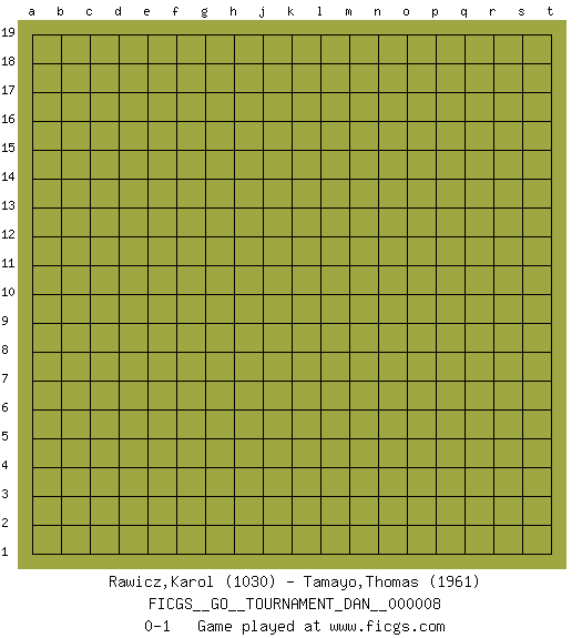 Last move : 0-1 2007 August 19 10:23:15 [Event "FICGS__GO__TOURNAMENT_DAN__000008"] [Site "FICGS"] [Date "2007.07.20"] [Round "1"] [Black "Rawicz,Karol"] [White "Tamayo,Thomas"] [Result "0-1"] [Rating 1 "1030"] [Rating 2 "1961"] 0-1 This go game has been lost on time (started : 2007.07.20 6:19:12) Here are the names of the openings (joseki) played in the four corners : Player White won this Go (weiqi, baduk) game. Follow this game move after move (download)... {it is} something unearthly... if there are sentient beings on other planets, then they play go. (Emanuel Lasker, chess world champion) I feel so... helpless. (C-3PO in Star Wars ep.3)