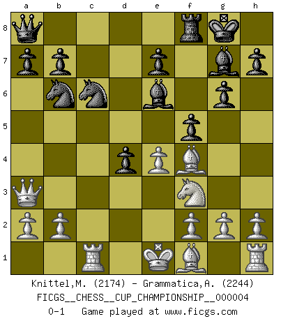 Last move : 0-1 2021 November 20 2:3:1 [Event "FICGS__CHESS__CUP_CHAMPIONSHIP__000004"] [Site "FICGS"] [Date "2021.09.20"] [Round "1"] [White "Knittel,Martin"] [Black "Grammatica,Andrea"] [Result "0-1"] [WhiteElo "2174"] [BlackElo "2244"] 1.Nf3 Nf6 2.c4 g6 3.Nc3 d5 4.cxd5 Nxd5 5.Qb3 Nb6 6.d4 Bg7 7.Bf4 Be6 8.Qa3 c5 9.e4 cxd4 10.Nb5 O-O 11.Nc7 Nc6 12.Nxa8 Qxa8 13.Rc1 f5 0-1 This chess game has been lost on time (started : 2021.09.20 1:58:51) Reti Opening Kingside Castling by player Black (move 10) Player Black won this chess game. Follow this game move after move (download)A man that will take back a move at Chess will pick a pocket. (Richard Fenton) Schach ist ein Reich, wo sich die menschliche Phantasie frei entfalten kann. (David Bronstein) El Ajedrez, como la música, como el amor, tiene el poder de hacer feliz a la gente. (Siegbert Tarrasch) Comme les marins qui ont mille raisons différentes d'aller en mer, les joueurs d'échecs en ont tout autant avant de s'installer devant une table et jouer... (Vincent Bertignac, philosophe) A woman without a man is like a fish without a bicycle. (Gloria Steinem)