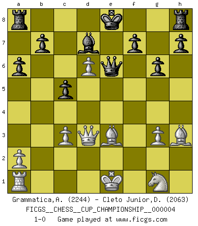 Last move : 1-0 2021 October 17 15:32:19 [Event "FICGS__CHESS__CUP_CHAMPIONSHIP__000004"] [Site "FICGS"] [Date "2021.09.20"] [Round "1"] [White "Grammatica,Andrea"] [Black "Cleto Junior,Dirceu"] [Result "1-0"] [WhiteElo "2244"] [BlackElo "2063"] 1.d4 Nf6 2.c4 c5 3.d5 e6 4.Nc3 exd5 5.cxd5 d6 6.e4 g6 7.f4 Bg7 8.Bb5+ Nbd7 9.e5 dxe5 10.fxe5 Nh5 11.e6 Qh4+ 12.g3 Nxg3 13.hxg3 Qxh1 14.Be3 Bxc3+ 15.bxc3 a6 16.exd7+ Bxd7 17.Bf1 Qe4 18.Qd3 Qe7 19.d6 Qe6 20.Bh3 1-0 Benoni : pawn storm variation Player White won this chess game. Follow this game move after move (download)I like the moment when I break a man's ego. (Bobby Fischer) Wenn Du nicht kämpfst, um anderen etwas zu beweisen, sondern nur für Dich selbst, dann bist du fast unbesiegbar. (Garry Kasparov) Si un gobernante no entiende al Ajedrez, ¿como puede governar él un reinado?. (El Rey Khusros II) Tous ces prétendus hommes politiques sont les pions, les Cavaliers, les Tours ou les Fous d'une partie d'échecs qui se jouera tant qu'un hasard ne renversera pas l'échiquier. (Honoré de Balzac) Man is reluctant to give credit for intelligence to anyone, except his enemies. (Albert Einstein)