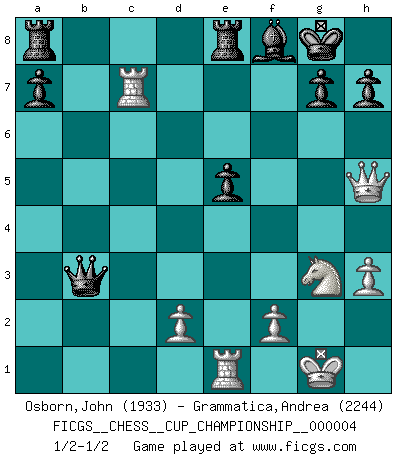 Last move : 1/2-1/2 2021 September 24 16:54:34 [Event "FICGS__CHESS__CUP_CHAMPIONSHIP__000004"] [Site "FICGS"] [Date "2021.09.20"] [Round "1"] [White "Osborn,John"] [Black "Grammatica,Andrea"] [Result "1/2-1/2"] [WhiteElo "1933"] [BlackElo "2244"] 1.e4 e5 2.Nf3 Nc6 3.Bc4 Nf6 4.Ng5 d5 5.exd5 Na5 6.Bb5+ c6 7.dxc6 bxc6 8.Bd3 Nd5 9.Nf3 Bd6 10.O-O Nf4 11.Nc3 Nxd3 12.cxd3 O-O 13.Re1 Re8 14.Ne4 c5 15.b3 Bf8 16.Ba3 f5 17.Ng3 Nc6 18.Rc1 f4 19.Ne4 Bg4 20.h3 Bh5 21.g4 fxg3 22.Nxg3 Bxf3 23.Qxf3 Nd4 24.Qh5 c4 25.Bb2 cxb3 26.Bxd4 Qxd4 27.axb3 Qxd3 28.Rc7 Qxb3 1/2-1/2 Two knights defense Kingside Castling by player White (move 10) Kingside Castling by player Black (move 12) This chess game ended in a draw. Follow this game move after move (download)The passion for playing Chess is one of the most unaccountable in the world. (H.G. Wells) Den Ruhm habe ich schon, jetzt brauche ich noch das Geld. (Wilhelm Steinitz) El Ajedrez es el gimnasio de la mente. (Blaise Pascal) Votre seul travail dans les ouvertures est d'obtenir un milieu de partie jouable. (Lajos Portish) There are two major products that came out of Berkeley: LSD and UNIX. We do not believe this is to be a coincidence. (Jeremy S. Anderson)
