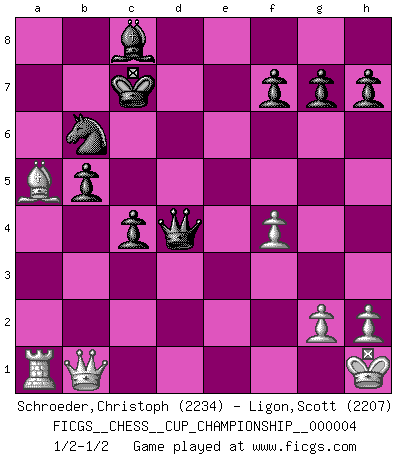 Last move : 1/2-1/2 2021 December 30 7:31:1 [Event "FICGS__CHESS__CUP_CHAMPIONSHIP__000004"] [Site "FICGS"] [Date "2021.09.20"] [Round "1"] [White "Schroeder,Christoph"] [Black "Ligon,Scott"] [Result "1/2-1/2"] [WhiteElo "2234"] [BlackElo "2207"] 1.d4 d5 2.c4 dxc4 3.e4 b5 4.a4 c6 5.axb5 cxb5 6.Nc3 Qb6 7.Nd5 Qb7 8.Bf4 e5 9.Bxe5 Nd7 10.Bf4 Ngf6 11.Nc7+ Kd8 12.Nxa8 Qxe4+ 13.Ne2 Qxa8 14.Nc3 Bb4 15.f3 Re8+ 16.Be2 a5 17.O-O Qc6 18.Re1 Bxc3 19.bxc3 a4 20.Bg3 Nd5 21.f4 N7b6 22.Bf3 Rxe1+ 23.Qxe1 Qe6 24.Qb1 Qe3+ 25.Kh1 Qxc3 26.Bxd5 Nxd5 27.Be1 Qxd4 28.Ba5+ Nb6 29.Rxa4 Kc7 30.Ra1 1/2-1/2 QGA : 3.e4 Kingside Castling by player White (move 17) This chess game ended in a draw. Follow this game move after move (download)You must take your opponent into a deep dark forest where 2+2=5, and the path leading out is only wide enough for one. (Mikhail Tal) Das Schach hält seine Meister in eigenen Banden, Fesseln; auf vielerlei Weise formt es ihren Geist, so dass die innere Freiheit selbst des Stärksten beeinflusst wird. (Albert Einstein) Aquel que ve no otra dirección en el juego que la de dar Jaque Mate a su oponente, nunca será un buen jugador de Ajedrez. (Euwe) Le pion, dans sa simplicité, marche droit devant lui, mais lorsqu'il prend, il le fait obliquement? Ainsi l'homme, tant qu'il reste pauvre, marche dans la droiture et vit honnêtement, mais lorsqu'il recherche les honneurs, il flatte, se parjure et, par les voies obliques, cherche une position supérieure sur l'échiquier du monde. (Jean de Galles) We're missing something. (Gregory House, House M.D.)