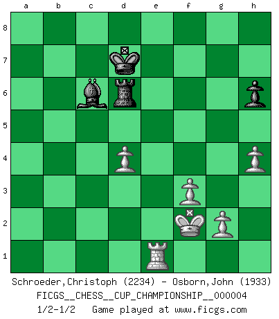 Last move : 1/2-1/2 2021 December 10 17:27:8 [Event "FICGS__CHESS__CUP_CHAMPIONSHIP__000004"] [Site "FICGS"] [Date "2021.09.20"] [Round "1"] [White "Schroeder,Christoph"] [Black "Osborn,John"] [Result "1/2-1/2"] [WhiteElo "2234"] [BlackElo "1933"] 1.d4 d5 2.c4 dxc4 3.e4 b5 4.a4 c6 5.axb5 cxb5 6.Nc3 Qb6 7.Nd5 Qb7 8.Bf4 e5 9.Bxe5 Nd7 10.Bf4 Ngf6 11.Nc7+ Kd8 12.Nxa8 Qxe4+ 13.Ne2 Qxa8 14.Nc3 Bb4 15.f3 Re8+ 16.Be2 Bxc3+ 17.bxc3 Nd5 18.Bd2 a5 19.Qb1 b4 20.cxb4 c3 21.Bg5+ f6 22.Rxa5 Qb7 23.Qb3 Nxb4 24.Qxc3 fxg5 25.Kf2 Nd5 26.Qd2 Nf4 27.Bc4 Qc7 28.Rxg5 Qxc4 29.Qxf4 Qc2+ 30.Kg3 Re2 31.Rg1 Nf6 32.Kh4 Re7 33.Rf1 h6 34.Rxg7 Rxg7 35.Qxf6+ Re7 36.Ra1 Bb7 37.Qf8+ Kd7 38.Qb8 Qc7 39.Qxc7+ Kxc7 40.Ra2 Rf7 41.Kg3 Rf6 42.Re2 Kd7 43.h4 Bc6 44.Re1 Rg6+ 45.Kf2 Rd6 46.Ke3 Rg6 47.Kf2 Rd6 48.Ke3 Re6+ 49.Kf2 Rd6 1/2-1/2 QGA : 3.e4 10 pieces endgame at move 39 : White KRPPPP , Black KRBP WHITE : King + 1 Rook 4 Pawns BLACK : King + 1 Rook 1 Bishop 1 Pawn This chess game ended in a draw. Follow this game move after move (download)Chess is like war on a board. (Bobby Fischer) Der Verteidiger gebe der Gewalt nach, aber nur der Gewalt. Er schaffe sich nicht freiwillig, etwa aus Blindheit oder aus Schrecken, irgendwelche Schwächen. Er lasse sich nicht bluffen. (Emanuel Lasker) El Ajedrez es el gimnasio de la mente. (Blaise Pascal) C'est une question de caractère, Beaucoup de gens perdent leur motivation très vite. D'autres, ils sont rares, peuvent la conserver très longtemps. J'aime les échecs, encore aujourd'hui je suis heureux d'analyser des parties. J'aime toujours gagner, je déteste encore perdre. Bien jouer est important pour mon intégrité intellectuelle et morale. Et puis les échecs vivent en ce moment une période historique grâce à Internet. Ils se développent dans les systèmes éducatifs à travers le monde. Ils sortent de leur ghetto, et c'est mon rôle de mener à bien cette révolution. (Gary Kasparov) A good player is always lucky. (Capablanca)