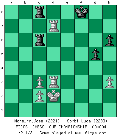 Last move : 1/2-1/2 2021 November 24 23:6:44 [Event "FICGS__CHESS__CUP_CHAMPIONSHIP__000004"] [Site "FICGS"] [Date "2021.09.20"] [Round "1"] [White "Moreira,Jose"] [Black "Sorbi,Luca"] [Result "1/2-1/2"] [WhiteElo "2221"] [BlackElo "2233"] 1.e4 c5 2.Nf3 d6 3.d4 cxd4 4.Nxd4 Nf6 5.Nc3 a6 6.Be3 e5 7.Nb3 Be6 8.f3 Be7 9.Qd2 O-O 10.O-O-O Nbd7 11.g4 b5 12.g5 Nh5 13.Kb1 Nb6 14.Na5 Qc7 15.a3 Rab8 16.Nd5 Nxd5 17.exd5 Bxd5 18.Qxd5 Qxa5 19.Bc4 Qd8 20.Ba2 Bxg5 21.Bxg5 Qxg5 22.Qxd6 Qf6 23.Qxf6 Nxf6 24.Rd6 a5 25.Rg1 Kh8 26.Ra6 e4 27.fxe4 Nxe4 28.Bd5 Nd2+ 29.Kc1 Nc4 30.Bxc4 bxc4 31.Rxa5 Rbc8 32.Rd5 g6 33.a4 f5 34.Kd2 f4 35.a5 f3 36.Rf1 c3+ 37.bxc3 Rc6 38.Rd3 f2 39.Ke2 Rf5 40.Rxf2 Rxa5 41.Rf7 Rc8 42.Rb7 Rh5 43.h3 Rhc5 44.Kd2 g5 45.Rbd7 R5c6 46.R3d5 h6 47.Rd3 Kg8 48.Rg3 Kf8 49.Rgd3 1/2-1/2 Sicilian : Najdorf, Byrne (English) attack Kingside Castling by player Black (move 9) Queenside Castling by player White (move 10) This chess game ended in a draw. Follow this game move after move (download)Fischer Chess play was always razor-sharp, rational and brilliant. One of the best ever. (Dave Regis) Ich las kürzlich ein Buch von Nietzsche. Er sagte Religion verdumme nur die Menschen. Ich stimme zu. (Robert James Fischer) Algunos sacrificios son sólidos, los demás son míos. (Mikhail Tal) Tous ces prétendus hommes politiques sont les pions, les Cavaliers, les Tours ou les Fous d'une partie d'échecs qui se jouera tant qu'un hasard ne renversera pas l'échiquier. (Honoré de Balzac) Fortune favours the audacious. (Desiderius Erasmus)