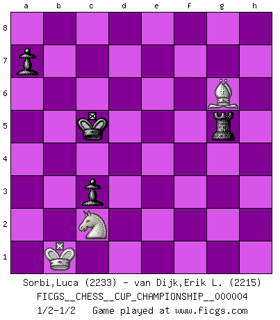 Last move : 1/2-1/2 2022 January 16 15:17:22 [Event "FICGS__CHESS__CUP_CHAMPIONSHIP__000004"] [Site "FICGS"] [Date "2021.09.20"] [Round "1"] [White "Sorbi,Luca"] [Black "van Dijk,Erik L."] [Result "1/2-1/2"] [WhiteElo "2233"] [BlackElo "2215"] 1.d4 f5 2.c4 Nf6 3.Nc3 g6 4.Nf3 Bg7 5.g3 O-O 6.Bg2 d6 7.O-O Qe8 8.Re1 Qf7 9.e4 fxe4 10.Nxe4 Nc6 11.Neg5 Qxc4 12.b3 Qb5 13.h3 Nb4 14.Rxe7 Nfd5 15.a4 Qd3 16.Qxd3 Nxd3 17.Re2 h6 18.Ne4 Bf5 19.Bd2 Rae8 20.Nh4 Bxd4 21.Rd1 Nxf2 22.Nxf5 Rxf5 23.Rxf2 Ne3 24.Bxe3 Bxe3 25.Kf1 Bxf2 26.Nxf2 Re3 27.g4 Rf4 28.Bxb7 Kg7 29.Bd5 Rc3 30.Kg2 c6 31.Be4 d5 32.Rd3 Rxd3 33.Bxd3 c5 34.Be2 Rd4 35.Kf3 Rd2 36.Nd1 Kf6 37.h4 Ke5 38.Ke3 Ra2 39.Nf2 Kd6 40.Nd3 c4 41.bxc4 dxc4 42.Ne1 Ra1 43.Nc2 Rxa4 44.Kd4 Ra2 45.Kc3 Kc5 46.Bf1 Ra4 47.Be2 Kd5 48.g5 hxg5 49.hxg5 Kc5 50.Bf3 Ra5 51.Be4 Rb5 52.Bxg6 Rb3+ 53.Kd2 Rg3 54.Kc1 c3 55.Kb1 Rxg5 1/2-1/2 Dutch with c4 & Nc3 Kingside Castling by player Black (move 5) Kingside Castling by player White (move 7) 10 pieces endgame at move 48 : White KBNP , Black KRPPPP WHITE : King + 1 Bishop 1 Knight 1 Pawn BLACK : King + 1 Rook 4 Pawns 9 pieces endgame at move 49 : White KBNP , Black KRPPP WHITE : King + 1 Bishop 1 Knight 1 Pawn BLACK : King + 1 Rook 3 Pawns 8 pieces endgame at move 52 : White KBNP , Black KRPP WHITE : King + 1 Bishop 1 Knight 1 Pawn BLACK : King + 1 Rook 2 Pawns 7 pieces endgame at move 55 : White KBN , Black KRPP WHITE : King + 1 Bishop 1 Knight BLACK : King + 1 Rook 2 Pawns This chess game ended in a draw. Follow this game move after move (download)Those who say they understand Chess, understand nothing. (Robert Hubner) Obendrein hat der FIDE-Präsident den Revolutionsführer Gaddafi zum »Großmeister« ernannt, am Ende der WM. Das ist lächerlich! (Joel Lautier) Botvinnik trató de alejar el misterio referente al Ajedrez, siempre relacionandolo a situaciones de la vida diaria. Solía llamar al Ajedrez un problema inexacto típico, similar a aquellos en que la gente tiene siempre que resolver a cada día. (Garry Kasparov) Une platitude souvent récitée à propos des Echecs est qu'une des choses les plus difficiles à réaliser est de gagner une position gagnante. Cela ne manque pas de sens mais, pour ma part, j'ai toujours trouvé plus difficile de gagner une position perdante. (Tim Krabbe) There's always a bigger fish. (Qui-Gon Jinn in Star Wars ep.1)