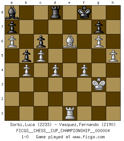 Last move : 1-0 2022 January 29 16:18:8 [Event "FICGS__CHESS__CUP_CHAMPIONSHIP__000004"] [Site "FICGS"] [Date "2021.09.20"] [Round "1"] [White "Sorbi,Luca"] [Black "Vasquez,Fernando"] [Result "1-0"] [WhiteElo "2233"] [BlackElo "2190"] 1.d4 Nf6 2.c4 e6 3.Nf3 b6 4.g3 Ba6 5.b3 Bb4+ 6.Bd2 Be7 7.Bg2 c6 8.Bc3 d5 9.Nbd2 O-O 10.Ne5 Qc7 11.O-O Nbd7 12.Nxd7 Nxd7 13.Rc1 Rad8 14.Qc2 Nf6 15.e4 dxe4 16.Nxe4 Nxe4 17.Qxe4 Bb7 18.Rfd1 Rd7 19.Qg4 Bf6 20.c5 h6 21.b4 Qc8 22.Ba1 Rfd8 23.h3 Bg5 24.Rb1 Bf6 25.a4 Kf8 26.h4 Kg8 27.Bf3 Ba8 28.Rbc1 b5 29.a5 Bb7 30.Qf4 Qc7 31.Qe3 Qc8 32.Bc3 Re7 33.Rd3 Qc7 34.Rcd1 Qc8 35.Qc1 R7e8 36.Be4 Qd7 37.Bd2 Rc8 38.Bf4 Bd8 39.Be5 Bc7 40.g4 f6 41.Bxc7 Rxc7 42.g5 f5 43.Bg2 Qd8 44.Qf4 h5 45.g6 Rd7 46.a6 Ba8 47.Re1 Kf8 48.Bf3 Qf6 49.Bxh5 Red8 50.Re5 Rd5 51.Rxd5 Rxd5 52.Qc7 Qe7 53.Qg3 Qf6 54.Bf3 Rd7 55.h5 f4 56.Qg4 Qf5 57.Rd1 Qxg4+ 58.Bxg4 Ke7 59.Kg2 Kf6 60.Kf3 Rd8 61.Kxf4 Rd5 62.Kg3 Ke7 63.f4 Rd8 64.Re1 Kf8 65.Bxe6 1-0 Queen's Indian : Nimzovich variation (exaggerated Fianchetto) Kingside Castling by player Black (move 9) Kingside Castling by player White (move 11) Player White won this chess game. Follow this game move after move (download)Chess is mental torture. (Garry Kasparov) Pläne sind die Träume des Verständigen. (Ernst Freiherr von Feuchtersleben) Todavía soy una víctima del Ajedrez. Tiene toda la belleza del arte y mucho mas. No puede ser comercializado. El Ajedrez es mas puro que el arte en su posición social. (Marcel Duchamp) Les échecs c'est le défi de l'alpiniste, toujours plus haut, prêt à tout pour monter à l'assaut du Roi ennemi. Les échecs, c'est de la musique en mouvement, un ballet majestueux pour les yeux. C'est de la poésie composée par les fantômes du passé qui au même titre que Rimbaud ou Verlaine méritent notre admiration. Les échecs, c'est de la peinture ou le moindre mouvement modifie le tableau pour en faire un Picasso ou un Van Gogh. Les échecs, c'est tout et rien, c'est la vie et la mort. Jjulie33 sur le forum de France-Echecs. If we knew what we were doing, we would not call it research. (Albert Einstein)
