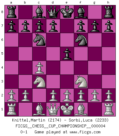 Last move : 0-1 2021 November 20 2:3:1 [Event "FICGS__CHESS__CUP_CHAMPIONSHIP__000004"] [Site "FICGS"] [Date "2021.09.20"] [Round "1"] [White "Knittel,Martin"] [Black "Sorbi,Luca"] [Result "0-1"] [WhiteElo "2174"] [BlackElo "2233"] 1.c4 e5 2.Nc3 Nf6 3.Nf3 Nc6 0-1 This chess game has been lost on time (started : 2021.09.20 1:58:51) English Opening Player Black won this chess game. Follow this game move after move (download)Castle early and often. (Rob Sillars) Frage: Wie viele Autos haben Sie schon zerstört? - Antwort: Nur zwei. (Loek van Wely) Ciertamente, de todas la drogas del mundo, el Ajedrez debe ser el mas placentero permamentemente. (Assiac) Un journaliste : 'Vous préférez avoir une dame de plus sur l'échiquier ou au lit ?' Boris Spassky : 'Ca dépend de la position.' My poor ole parrot... Is not in the circulation of displays ....poo hoo hoo :) (Wayne Lowrance's enigma)