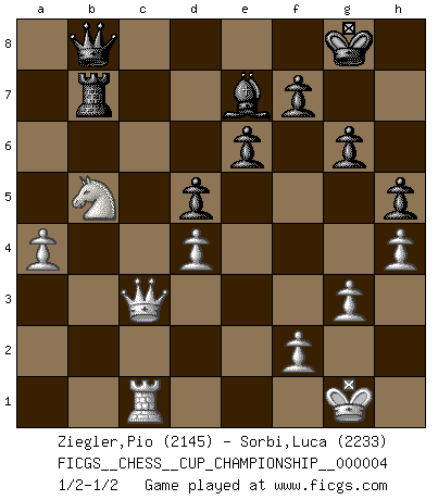 Last move : 1/2-1/2 2021 November 21 21:54:15 [Event "FICGS__CHESS__CUP_CHAMPIONSHIP__000004"] [Site "FICGS"] [Date "2021.09.20"] [Round "1"] [White "Ziegler,Pio"] [Black "Sorbi,Luca"] [Result "1/2-1/2"] [WhiteElo "2145"] [BlackElo "2233"] 1.d4 Nf6 2.c4 e6 3.Nf3 d5 4.Nc3 Be7 5.Bf4 O-O 6.e3 Nbd7 7.c5 Nh5 8.Bd3 Nxf4 9.exf4 b6 10.b4 a5 11.a3 c6 12.O-O Ba6 13.Bxa6 Rxa6 14.Qe2 Qa8 15.b5 cxb5 16.Qxb5 Ra7 17.c6 Nb8 18.Rfc1 Rc7 19.Ne5 Rfc8 20.Qxb6 Nxc6 21.Nb5 Rb7 22.Nxc6 Bf8 23.Ne7+ Bxe7 24.Rxc8+ Qxc8 25.Qxa5 Qb8 26.a4 Qxf4 27.Qc3 Qb8 28.g3 g6 29.h4 h5 30.Rc1 1/2-1/2 Queen's pawn game Kingside Castling by player Black (move 5) Kingside Castling by player White (move 12) This chess game ended in a draw. Follow this game move after move (download)Good positions don't win games, good moves do. (Gerald Abrahams) Ein Schachgenie ist jemand der verdammt gut Schach spielt. (Jonathan Levitt) Todo lo que importa ante el tablero de Ajedrez son buenas jugadas. (Bobby Fischer) Le pion, dans sa simplicité, marche droit devant lui, mais lorsqu'il prend, il le fait obliquement? Ainsi l'homme, tant qu'il reste pauvre, marche dans la droiture et vit honnêtement, mais lorsqu'il recherche les honneurs, il flatte, se parjure et, par les voies obliques, cherche une position supérieure sur l'échiquier du monde. (Jean de Galles) I teach you to lie, cheat and steal, and as soon as my back's turned you wait in line ? (Gregory House, House M.D.)