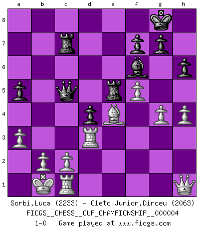 Last move : 1-0 2021 December 3 10:27:38 [Event "FICGS__CHESS__CUP_CHAMPIONSHIP__000004"] [Site "FICGS"] [Date "2021.09.20"] [Round "1"] [White "Sorbi,Luca"] [Black "Cleto Junior,Dirceu"] [Result "1-0"] [WhiteElo "2233"] [BlackElo "2063"] 1.e4 c5 2.Nf3 d6 3.d4 cxd4 4.Nxd4 Nf6 5.Nc3 a6 6.Be3 e6 7.a3 Be7 8.Qe2 e5 9.Nf5 Bxf5 10.exf5 d5 11.f4 exf4 12.Bxf4 O-O 13.O-O-O Nc6 14.Qf3 d4 15.Bc4 Rc8 16.Nd5 Nxd5 17.Bxd5 Qb6 18.Kb1 Bf6 19.Rd3 Qc5 20.Rc1 Rfe8 21.g4 h6 22.h4 Ne5 23.Bxe5 Rxe5 24.Bxb7 Rc7 25.Qh1 a5 26.Be4 1-0 Sicilian : Najdorf, Byrne (English) attack Kingside Castling by player Black (move 12) Queenside Castling by player White (move 13) Player White won this chess game. Follow this game move after move (download)Chess is above all, a fight ! (Emanuel Lasker) Ein Kibitz ist einer, der deinem Gegner gute Ratschläge gibt. (Andrew Soltis) Aquellos que dicen que entienden al Ajedrez, no entienden nada. (Robert Hubner) Le génie consiste à savoir transgresser les règles au moment opportun. (Teichmann) The project of the man are lower than those of the sky. (Chinese proverb)