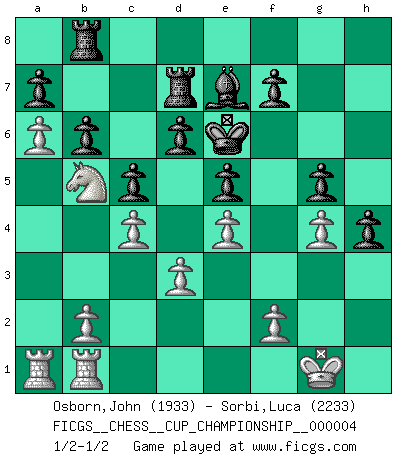 Last move : 1/2-1/2 2021 November 21 13:7:31 [Event "FICGS__CHESS__CUP_CHAMPIONSHIP__000004"] [Site "FICGS"] [Date "2021.09.20"] [Round "1"] [White "Osborn,John"] [Black "Sorbi,Luca"] [Result "1/2-1/2"] [WhiteElo "1933"] [BlackElo "2233"] 1.e4 c5 2.Nf3 d6 3.Nc3 e5 4.Bc4 Be7 5.d3 Nc6 6.O-O Nf6 7.Bg5 O-O 8.Bxf6 Bxf6 9.Nd5 g6 10.c3 Bg7 11.Qd2 Be6 12.a4 Rc8 13.Rfb1 h6 14.h4 Bg4 15.h5 gxh5 16.Nh2 Be6 17.Qd1 h4 18.Qh5 Qg5 19.Qxg5 hxg5 20.Nf1 Kh7 21.Nfe3 Kg6 22.g3 Rh8 23.g4 Bf6 24.Nf5 Rhd8 25.a5 Bxd5 26.Bxd5 Rd7 27.a6 b6 28.Bxc6 Rxc6 29.Ne3 Bd8 30.c4 Kf6 31.Kg2 Ke6 32.Kg1 Rc8 33.Nd5 Rc6 34.Nc3 Rc8 35.Re1 Rb8 36.Nb5 Be7 37.Reb1 1/2-1/2 Sicilian Kingside Castling by player White (move 6) Kingside Castling by player Black (move 7) This chess game ended in a draw. Follow this game move after move (download)You are for me the Queen on d8 and I am the Pawn on d7 !! (Eduard Gufeld) Es hat in meinem Leben Zeiten gegeben, in denen das Schachspiel, wenn nicht zum Lebenszweck, so doch zu einem regelrechten Lebensersatz geworden ist. Man fühlt sich in solchen Zeiten nicht so, als besäße man eine göttliche Gabe, sondern eher so, als sei man von ihr besessen. (Garry Kasparov) Las piezas de Ajedrez son los bloques del alfabeto que moldean los pensamientos; y esos pensamientos, aunque hagan un diseño visual en el tablero, expresan abstractamente su belleza como un poema. (Marcel Duchamp) Si rien de grave n'est détecté lors de l'analyse d'une position, on joue alors le coup. Seconde règle de Blumenfeld. A good programmer is someone who always looks both ways before crossing a one-way street. (Doug Linder)