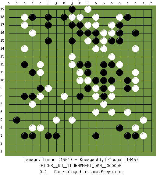 Last move : 0-1 2007 December 4 20:17:32 [Event "FICGS__GO__TOURNAMENT_DAN__000008 "] [Site "FICGS"] [Date "2007.07.20"] [Round "1"] [Black "Tamayo,Thomas "] [White "Kobayashi,Tetsuya "] [Result "0-1"] [Rating 1 "1961"] [Rating 2 "1846"] 1.r16 d16 2.p17 r4 3.c3 r11 4.p4 q6 5.r3 s3 6.q3 s5 7.m3 r14 8.f17 c14 9.d18 c17 10.j17 d4 11.d3 e4 12.b5 d7 13.f3 c18 14.c8 g5 15.g3 l17 16.j15 o17 17.p16 p18 18.q18 o16 19.o15 n15 20.p15 l15 21.l18 k18 22.k17 m18 23.l16 m17 24.m16 n16 25.k16 j18 26.m15 n14 27.d8 j5 28.c12 o6 29.q10 r10 30.q9 p12 31.n10 l10 32.n8 m6 33.l9 o9 34.o10 o8 35.o12 o13 36.l11 k10 37.n9 n7 38.n12 m14 39.h18 k11 40.l12 j13 41.k12 j12 42.k8 h8 43.p11 r9 44.m10 m8 45.n11 m9 46.j19 l19 47.f18 e12 48.d11 e11 49.f15 e8 50.e9 f9 0-1 This go game has been lost on time (started : 2007.07.20 6:19:12) Here are the names of the openings (joseki) played in the four corners : Corner q4 : r4 p4Komoku (Somok, Xiao~mu`) 3-4 Point. The komoku (3-4) point is the traditional corner enclosure move..Ikken Takagakari (Hankan Nop'dakeolch'im, Yi Gaogua`jiao~, 1-Space High Approach). The 5-4 approach move has become more popular in modern times, as modern Go emphasizes speed and influence. Corner d16 : d16 f17Hoshi (Hwajeom, Seongjeom, Xingwei`) 4-4 Point. The star or hoshi (4-4) point, emphasizing influence at the potential expense of territory.Ikken Kakari (Hankan Keolch'im, Yi Gua`jiao~, 1-Space Low Approach). Black 2 is the standard approach move to the 4-4. Corner d4 : c3 d4San-San (Sam-Sam, San-San) 3-3 Point. The San-San (3-3) point, emphasizing territory at the expense of influence.Kata-tsuki (shoulder hit). The shoulder-hit is the traditional answer to the 3-3. The direction of Black 3 depends on the positions on the side. Crawling once may be the premise for a follow-up move of sliding with a knight's move in the opposite direction. If Black plays 3 at 3-4 (to the right), the follow-on knight's move is then played at the top (e.g. 3-4, 4-5, 5-2). Black's knight's move reduces territory potential on the side it is played. Player White won this Go (weiqi, baduk) game.Follow this game move after move (download ) Don't disturb symmetry. (Anonymous) They misunderestimated me. (George W. Bush, Bentonville nov. 6, 2000)