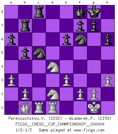 Last move : 1/2-1/2 2021 October 11 20:53:42 [Event "FICGS__CHESS__CUP_CHAMPIONSHIP__000004"] [Site "FICGS"] [Date "2021.09.20"] [Round "1"] [White "Perevozchikov,Vjacheslav"] [Black "Wiaderek,Piotr"] [Result "1/2-1/2"] [WhiteElo "2232"] [BlackElo "2193"] 1.d4 d5 2.Nf3 Nf6 3.Bf4 c5 4.e3 e6 5.Nbd2 Qb6 6.Rb1 Bd6 7.Bxd6 Qxd6 8.dxc5 Qxc5 9.c4 O-O 10.cxd5 Qxd5 11.Bc4 Qd6 12.O-O b6 13.Rc1 Rd8 14.Be2 Bb7 15.Qa4 Nbd7 16.Rfd1 Qf8 17.h3 h6 18.Nd4 a6 19.a3 Nc5 20.Qc2 Rac8 21.Qb1 b5 22.Bf3 Rd7 23.Bxb7 Rxb7 1/2-1/2 Queen's Bishop game Kingside Castling by player Black (move 9) Kingside Castling by player White (move 12) This chess game ended in a draw. Follow this game move after move (download)White lost because he failed to remember the right continuation and had to think up the moves himself. (Siegbert Tarrasch) Nicht daß Diemer aus Opportunismus Mitglied der NSDAP geworden wäre. Er war ein Fanatiker, in allem, was er tat. (Hans Ree) El Ajedrez es un invernadero donde los frutos del carácter pueden madurar mas completamente que en la vida. (Edward Morgan Foster) Aux échecs, l'amour-propre est satisfait quand on remporte la victoire, mais il n'y a pas de honte à être battu. (Benjamin Franklin) If we don't succeed, we run the risk of failure. (George W. Bush)