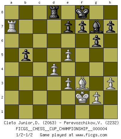Last move : 1/2-1/2 2021 November 29 4:16:2 [Event "FICGS__CHESS__CUP_CHAMPIONSHIP__000004"] [Site "FICGS"] [Date "2021.09.20"] [Round "1"] [White "Cleto Junior,Dirceu"] [Black "Perevozchikov,Vjacheslav"] [Result "1/2-1/2"] [WhiteElo "2063"] [BlackElo "2232"] 1.d4 Nf6 2.c4 g6 3.Nc3 d5 4.cxd5 Nxd5 5.e4 Nxc3 6.bxc3 Bg7 7.Be3 c5 8.Qd2 cxd4 9.cxd4 Nc6 10.Nf3 Bg4 11.Rd1 O-O 12.Be2 Qa5 13.h3 Bxf3 14.Qxa5 Nxa5 15.Bxf3 Rac8 16.e5 Rc2 17.O-O Rxa2 18.Ra1 Rxa1 19.Rxa1 b6 20.Rc1 Rd8 21.Rc3 b5 22.Ra3 Nc4 23.Rxa7 Nxe3 24.fxe3 Kf8 25.Kf2 1/2-1/2 King's Indian defense, 3.Nc3 Kingside Castling by player Black (move 11) Kingside Castling by player White (move 17) This chess game ended in a draw. Follow this game move after move (download)Alekhine is a poet who creates a work of art out of something that would hardly inspire another man to send home a picture post card. (Max Euwe) Rauchen ist dem Schachspieler bei seiner Arbeit, also im Wettkampf, untersagt. (Viktor Kortschnoi) El Ajedrez lo es todo: arte, ciencia y deporte. (Anatoly Karpov) La tactique est l'élément le plus important du milieu de jeu. (Siegbert Tarrasch) Only sick music makes money today. (Friedrich Nietzsche)