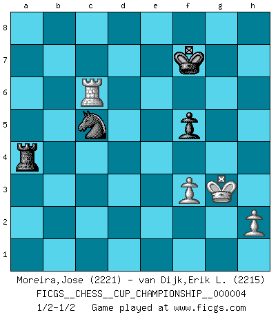 Last move : 1/2-1/2 2021 December 19 20:36:39 [Event "FICGS__CHESS__CUP_CHAMPIONSHIP__000004"] [Site "FICGS"] [Date "2021.09.20"] [Round "1"] [White "Moreira,Jose"] [Black "van Dijk,Erik L."] [Result "1/2-1/2"] [WhiteElo "2221"] [BlackElo "2215"] 1.d4 c5 2.d5 Nf6 3.c4 b5 4.cxb5 a6 5.bxa6 g6 6.Nc3 Bxa6 7.e4 Bxf1 8.Kxf1 d6 9.g3 Bg7 10.Nf3 O-O 11.a4 Na6 12.Qe2 Qb6 13.Kg2 Nc7 14.Re1 Rfb8 15.Rb1 Nfe8 16.Bf4 Qa6 17.e5 Qxe2 18.Rxe2 f6 19.exd6 exd6 20.Rd1 h6 21.Re7 f5 22.Rde1 Bxc3 23.bxc3 Nxd5 24.R7e6 Nxf4+ 25.gxf4 Kf8 26.Rxg6 Rxa4 27.Rxh6 Rxf4 28.Rh8+ Kf7 29.Ng5+ Kg7 30.Ne6+ Kxh8 31.Nxf4 Nf6 32.f3 Rb2+ 33.Kg3 Rd2 34.c4 Rd4 35.Re2 Rxc4 36.Re6 Kg7 37.Rxd6 Kf7 38.Ra6 Rd4 39.Rc6 Nd7 40.Ne6 Ra4 41.Nxc5 Nxc5 1/2-1/2 Old Benoni defense Kingside Castling by player Black (move 10) 10 pieces endgame at move 37 : White KRNPP , Black KRNPP WHITE : King + 1 Rook 1 Knight 2 Pawns BLACK : King + 1 Rook 1 Knight 2 Pawns 9 pieces endgame at move 41 : White KRNPP , Black KRNP WHITE : King + 1 Rook 1 Knight 2 Pawns BLACK : King + 1 Rook 1 Knight 1 Pawn 8 pieces endgame at move 41 : White KRPP , Black KRNP WHITE : King + 1 Rook 2 Pawns BLACK : King + 1 Rook 1 Knight 1 Pawn This chess game ended in a draw. Follow this game move after move (download)Some part of a mistake is always correct. (Savielly Tartakover) Schach sollte überall auf der Welt Schulfach werden. Es fördert die geistige Auseinandersetzung. Es lehrt die Demut in der Niederlage. (Garry Kasparov) Cuando estes solo, cuando te sientas un extraño en el mundo, juega al Ajedrez. Esto levantará tu espiritu y será tu consejero de guerra. (Aristóteles) C'est la seule position que je connaisse où les deux camps sont mals. Propos prêtés à V. Anand. Success without honor is an unseasoned dish; it will satisfy your hunger, but it won't taste good. (Joe Paterno)