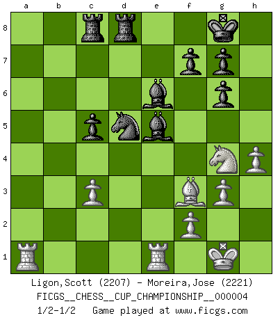 Last move : 1/2-1/2 2021 October 26 13:19:48 [Event "FICGS__CHESS__CUP_CHAMPIONSHIP__000004"] [Site "FICGS"] [Date "2021.09.20"] [Round "1"] [White "Ligon,Scott"] [Black "Moreira,Jose"] [Result "1/2-1/2"] [WhiteElo "2207"] [BlackElo "2221"] 1.e4 e5 2.Nf3 Nc6 3.Bb5 a6 4.Ba4 Nf6 5.O-O Be7 6.Re1 b5 7.Bb3 O-O 8.c3 d5 9.exd5 Nxd5 10.Nxe5 Nxe5 11.Rxe5 c6 12.d3 Bd6 13.Re1 Bf5 14.Qf3 Qh4 15.g3 Qh3 16.Be3 Bxd3 17.Nd2 Bf5 18.Bd4 Rfd8 19.a4 Bg4 20.Qe4 Rac8 21.Nf3 Qh5 22.Ne5 Be6 23.Bd1 Qh6 24.axb5 axb5 25.h4 c5 26.Ng4 Qg6 27.Qxg6 hxg6 28.Be5 b4 29.Bf3 bxc3 30.bxc3 Bxe5 1/2-1/2 Ruy Lopez : Closed, 7...O-O Kingside Castling by player White (move 5) Kingside Castling by player Black (move 7) This chess game ended in a draw. Follow this game move after move (download)A man without frontiers. He didn't divide the East and the West, he brought them together in their admiration for him. (Ljubomir Ljubojevic, about Bobby Fischer's death) Mein Gehirn das ist mein zweitwichtigstes Organ [Aus dem Film: Der Schläfer]. (Woody Allen) Una victoria por una combinación errónea, aunque sea espectacular, me llena de horror artístico. (Wilhelm Steinitz) Les échecs, c'est la lutte contre l'erreur. (Johannes Zukertort) A shortcut is the longest distance between two points. (Don Groves)