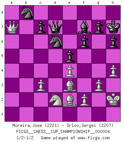Last move : 1/2-1/2 2021 October 9 7:20:7 [Event "FICGS__CHESS__CUP_CHAMPIONSHIP__000004"] [Site "FICGS"] [Date "2021.09.20"] [Round "1"] [White "Moreira,Jose"] [Black "Orlov,Vladimir"] [Result "1/2-1/2"] [WhiteElo "2221"] [BlackElo "2207"] 1.c4 e5 2.Nc3 Nf6 3.Nf3 Nc6 4.e4 Bb4 5.d3 d6 6.a3 Bxc3+ 7.bxc3 h6 8.g3 O-O 9.Bg2 Rb8 10.a4 a6 11.O-O b5 12.cxb5 axb5 13.axb5 Rxb5 14.Be3 Rb8 15.h3 Be6 16.Ra6 Ne7 17.Qa1 Ra8 18.Nd2 Rxa6 19.Qxa6 Qd7 20.Kh2 d5 21.Qa1 Rb8 22.Rd1 dxe4 23.dxe4 Qc6 24.Qa3 Qd7 25.Qa1 Qc6 26.Qa3 Qd7 27.Ra1 Ne8 28.Bf1 Nd6 29.Qa7 Nc6 30.Qc5 Nb7 31.Qa3 Nd6 32.Qc5 Nb7 33.Qa3 Nd6 34.h4 f6 35.Bc5 Nb5 36.Qc1 Nd6 37.Ra6 Nb7 38.Be3 Nd6 39.Qa3 Nd8 40.Ra7 Nc6 41.Ra8 Rxa8 42.Qxa8+ Kh7 43.Be2 Bf7 44.Qa4 Nb8 45.Qa7 1/2-1/2 English Opening Kingside Castling by player Black (move 8) Kingside Castling by player White (move 11) This chess game ended in a draw. Follow this game move after move (download)By this measure (on the gap between Fischer & his contemporaries), I consider him the greatest world champion. (Garry Kasparov) Spielt Blackmar-Diemer-Gambit, und das Matt kommt von selbst! (Emil Joseph Diemer) Observen a Garry Kasparov. Después de una derrota, invariablemente el gana la próxima partida. Prácticamente hace pedazos a su siguiente oponente. Eso es algo que tenemos que aprender a lograr. (Maurice Ashley) Pour moi, les échecs ne sont pas un jeu mais un art. (Alexandre Alekhine) Good decisions come from experience, and experience comes from bad decisions. (Anonymous)