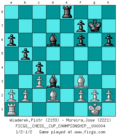 Last move : 1/2-1/2 2021 October 1 4:27:31 [Event "FICGS__CHESS__CUP_CHAMPIONSHIP__000004"] [Site "FICGS"] [Date "2021.09.20"] [Round "1"] [White "Wiaderek,Piotr"] [Black "Moreira,Jose"] [Result "1/2-1/2"] [WhiteElo "2193"] [BlackElo "2221"] 1.e4 e5 2.Nf3 Nc6 3.Bb5 a6 4.Ba4 Nf6 5.O-O Be7 6.Re1 b5 7.Bb3 O-O 8.c3 d5 9.exd5 Nxd5 10.Nxe5 Nxe5 11.Rxe5 c6 12.Re1 Bd6 13.d3 Bf5 14.Qf3 Bg6 15.Bd2 h6 16.Na3 Nf6 17.Nc2 c5 18.Ne3 Bxd3 19.Nd5 c4 20.Nxf6+ Qxf6 21.Qxf6 gxf6 22.Bd1 Rae8 23.Rxe8 Rxe8 24.Bf3 Kg7 1/2-1/2 Ruy Lopez : Closed, 7...O-O Kingside Castling by player White (move 5) Kingside Castling by player Black (move 7) This chess game ended in a draw. Follow this game move after move (download)It is difficult to play against Einstein's theory --on his first loss to Fischer. (Mikhail Tal) Ich hatte meine größten Erfolge, als ich 47 Jahre alt war. Kasparow war noch nicht mal 42 und hat das Schach schon im Stich gelassen. (Viktor Kortschnoi) Bobby es la celebridad menos entendida y malinterpretada que camina el la faz de esta tierra. (Yasser Seirawan) Les sacrifices démontrent seulement que quelqu'un a gaffé. (Savielly Tartacover) True nature is revealed in times of difficulty. (Chinese proverb)