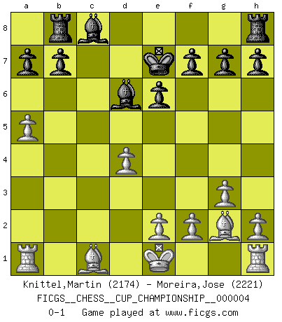 Last move : 0-1 2021 November 21 5:17:28 [Event "FICGS__CHESS__CUP_CHAMPIONSHIP__000004"] [Site "FICGS"] [Date "2021.09.20"] [Round "1"] [White "Knittel,Martin"] [Black "Moreira,Jose"] [Result "0-1"] [WhiteElo "2174"] [BlackElo "2221"] 1.Nf3 Nf6 2.c4 c5 3.Nc3 Nc6 4.g3 d5 5.d4 e6 6.cxd5 Nxd5 7.Bg2 Nxd4 8.Nxd4 Nxc3 9.bxc3 cxd4 10.Qxd4 Qxd4 11.cxd4 Bd6 12.a4 Rb8 13.a5 Ke7 0-1 This chess game has been lost on time (started : 2021.09.20 1:58:51) Reti Opening Player Black won this chess game. Follow this game move after move (download)He who takes the Queen's Knight's Pawn will sleep in the streets. (Anonymous) Schach ist ein Kampf gegen den Fehler. (Johannes Herrman Zukertort) Un juego de Ajedrez es un dialogo, una conversación entre un jugador y su oponente. Cada movimiento del oponente puede contener amenazas o tropiezos, pero un jugador no se puede defender de las amenazas o tomar ventaja de los tropiezos si es que no se pregunta a sí mismo: ¿Que es lo que mi oponente va a hacer después de cada movida?. (Bruce A. Moon) Il n'y a plus de joueurs du niveau de Jacob Murray dont la seule quête est le beau jeu, le plaisir de voir les pièces construire quelque chose. Sur 10 idées à la minute, 9 seront sans intérêt, la dernière s'avèrera géniale. (Christian Bauer) I'll be back. (Arnold Schwarzenegger)