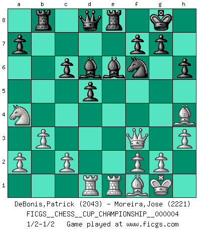 Last move : 1/2-1/2 2021 October 5 18:59:52 [Event "FICGS__CHESS__CUP_CHAMPIONSHIP__000004"] [Site "FICGS"] [Date "2021.09.20"] [Round "1"] [White "DeBonis,Patrick"] [Black "Moreira,Jose"] [Result "1/2-1/2"] [WhiteElo "2043"] [BlackElo "2221"] 1.e4 e5 2.Nf3 Nc6 3.d4 exd4 4.Nxd4 Nf6 5.Nc3 Bb4 6.Nxc6 bxc6 7.Bd3 O-O 8.O-O d5 9.exd5 cxd5 10.h3 Re8 11.Bg5 c6 12.Qf3 Bd6 13.Rfe1 Be6 14.Bh4 h6 15.Rad1 Rb8 16.b3 Bb4 17.Bf1 Bd6 18.Na4 Be7 19.Bg3 Bd6 20.Bh4 Be7 21.Bg3 Bd6 22.Bh4 1/2-1/2 Scotch : Schmidt variation Kingside Castling by player Black (move 7) Kingside Castling by player White (move 8) This chess game ended in a draw. Follow this game move after move (download)The passed Pawn is a criminal, who should be kept under lock and key. Mild measures, such as police surveillance, are not sufficient. (Aaron Nimzovich) Pläne sind die Träume des Verständigen. (Ernst Freiherr von Feuchtersleben) El estómago es una parte esencial del maestro de Ajedrez. (Bent Larsen) Le joueur d'Echecs qui veut atteindre le top est obligé de développer son propre credo créatif. Alexeï Stepanovicth Souétine. Il est facile d'écrire des livres ! Ce qui est difficile, c'est de jouer ! (Alexeï Stepanovicth Souétine) SEO proverb : Make your website optimized for human beings, not for search engines.