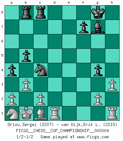 Last move : 1/2-1/2 2021 December 10 3:42:20 [Event "FICGS__CHESS__CUP_CHAMPIONSHIP__000004"] [Site "FICGS"] [Date "2021.09.20"] [Round "1"] [White "Orlov,Vladimir"] [Black "van Dijk,Erik L."] [Result "1/2-1/2"] [WhiteElo "2207"] [BlackElo "2215"] 1.e4 c5 2.Nf3 d6 3.d4 cxd4 4.Nxd4 Nf6 5.Nc3 a6 6.Bg5 Nbd7 7.Qe2 h6 8.Bh4 g6 9.f4 e5 10.fxe5 dxe5 11.O-O-O Qc7 12.Nb3 b5 13.Kb1 Bb7 14.Nd5 Nxd5 15.exd5 Bd6 16.Qd2 O-O 17.Qxh6 Rfe8 18.Be2 Rec8 19.Bd3 Bf8 20.Qg5 a5 21.d6 Qxd6 22.Bf5 Bd5 23.Qd2 gxf5 24.Qxd5 Qc7 25.Na1 Nb6 26.Qf3 Qc4 27.Bf6 Qg4 28.Qxg4+ fxg4 29.Bxe5 Nc4 30.Bf4 Bg7 31.Bc1 a4 32.b3 Rab8 33.h3 1/2-1/2 Sicilian : Najdorf, 6.Bg5 Queenside Castling by player White (move 11) Kingside Castling by player Black (move 16) This chess game ended in a draw. Follow this game move after move (download)Fischer is under obligation to nobody. (Joseph Platz) Man gibt nur Pakete auf. (Paul Keres) Nunca nadie ha ganado una partida de Ajedrez rindiendose. (Unknown) Si je n'étais pas joueur d'échecs, je serais le meilleur dans quelque chose d'autre. (Anatoli Karpov) Creativity is allowing yourself to make mistakes. Art is knowing which ones to keep. (Scott Adams)