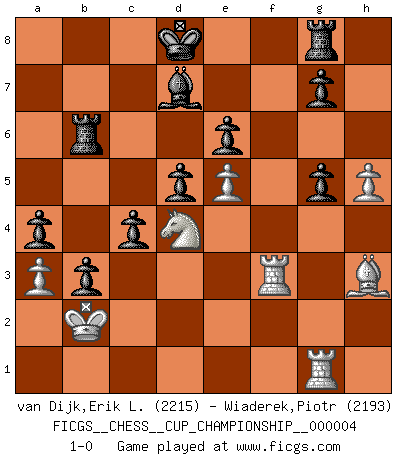 Last move : 1-0 2021 December 20 6:39:36 [Event "FICGS__CHESS__CUP_CHAMPIONSHIP__000004"] [Site "FICGS"] [Date "2021.09.20"] [Round "1"] [White "van Dijk,Erik L."] [Black "Wiaderek,Piotr"] [Result "1-0"] [WhiteElo "2215"] [BlackElo "2193"] 1.e4 e6 2.d4 d5 3.Nc3 Nf6 4.e5 Nfd7 5.f4 c5 6.Nf3 Nc6 7.Be3 Qb6 8.Na4 Qa5+ 9.c3 b6 10.Bd2 c4 11.b4 Nxb4 12.cxb4 Bxb4 13.Qc2 Bxd2+ 14.Nxd2 b5 15.Nc3 O-O 16.a3 b4 17.Qa4 Qxa4 18.Nxa4 a5 19.Rb1 Nb8 20.Be2 Na6 21.Kf2 Rb8 22.Ke3 Bd7 23.Nc5 Nxc5 24.dxc5 Rfc8 25.Kd4 Kf8 26.h4 h6 27.Nf3 Ba4 28.Rhc1 b3 29.Kc3 Rxc5 30.Nd4 Bd7 31.h5 Ke7 32.Bg4 Rc7 33.Rb2 Re8 34.Rf1 Kf8 35.Re2 Rb7 36.Bf3 Ke7 37.f5 Kd8 38.Bg4 Rb8 39.Bh3 Rb6 40.fxe6 fxe6 41.g4 Ke7 42.Ref2 Rg8 43.Rf7+ Ke8 44.Kb2 a4 45.R7f3 Kd8 46.g5 hxg5 47.Rg1 1-0 French : Steinitz, Boleslavsky variation Kingside Castling by player Black (move 15) Player White won this chess game. Follow this game move after move (download)A bad day of Chess is better than any good day at work. (Anonymous) Ihnen, Herr Lasker, habe ich nur drei Worte zu sagen: Schach und matt. (Siegbert Tarrasch) Ser exitoso en el Ajedrez te permite descubrir tu propia personalidad. Eso es lo que deseo para los niños de mi clase. (Saudin Robovic) L'attaque fait le spectacle, la défense gagne les matchs. (Dicton footballistique) Nobody is always a winner, and anybody who says he is, is either a liar or doesn't play poker. (Amarillo Slim)