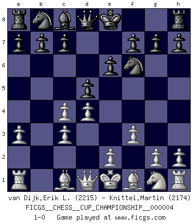 Last move : 1-0 2021 November 22 7:30:51 [Event "FICGS__CHESS__CUP_CHAMPIONSHIP__000004"] [Site "FICGS"] [Date "2021.09.20"] [Round "1"] [White "van Dijk,Erik L."] [Black "Knittel,Martin"] [Result "1-0"] [WhiteElo "2215"] [BlackElo "2174"] 1.d4 Nf6 2.c4 e6 3.Nc3 Bb4 4.f3 d5 5.a3 Bxc3+ 6.bxc3 1-0 This chess game has been lost on time (started : 2021.09.20 1:58:51) Nimzo-Indian : Kmoch variation Player White won this chess game. Follow this game move after move (download)The King is a fighting piece. Use it ! (Wilhelm Steinitz) Der Knackpunkt bei der Konzentration ist, daß wir nur durch sie etwas Neues und Ungewöhnliches am Schachbrett finden können. Sie ist der einzige Weg durch neue neue Ideen eine Überraschung zu bereiten. (Garry Kasparov) Una compensación adecuada por un sacrificio es tener una combinación sólida que conduce a una posición ganadora; una compensación adecuada por una metida de pata es dejar a tu oponente arrebatar una derrota de las fauces de la victoria. (Bruce A. Moon) Dieu déplace le joueur, et celui-ci la pièce. Quel Dieu derrière Dieu commence donc la trame ? Arturo Perez-Reverte (prix de littérature policière 1993). The intuitive mind is a sacred gift; the rational mind is a faithful servant. We have created a society that honors the servant but has forgotten the gift. (Albert Einstein)