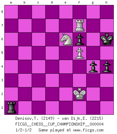 Last move : 1/2-1/2 2022 January 31 3:42:8 [Event "FICGS__CHESS__CUP_CHAMPIONSHIP__000004"] [Site "FICGS"] [Date "2021.09.20"] [Round "1"] [White "Denisov,Timofey"] [Black "van Dijk,Erik L."] [Result "1/2-1/2"] [WhiteElo "2149"] [BlackElo "2215"] 1.d4 Nf6 2.c4 c5 3.d5 b5 4.cxb5 a6 5.bxa6 g6 6.Nc3 Bxa6 7.e4 Bxf1 8.Kxf1 d6 9.Nf3 Qc8 10.h3 Bg7 11.g3 O-O 12.Kg2 Na6 13.Bg5 Qb7 14.Qe2 h6 15.Bxf6 Bxf6 16.Rhd1 Nb8 17.e5 dxe5 18.Nxe5 Nd7 19.Nxd7 Qxd7 20.Rac1 Bd4 21.b3 Rfd8 22.Rd2 Qb7 23.Qf3 Ra7 24.h4 h5 25.d6 Rxd6 26.Qxb7 Rxb7 27.Ne4 Rd5 28.Rc4 Rbd7 29.a4 Rb7 30.Nc3 R5d7 31.Nb5 e5 32.Rd3 Kg7 33.f4 exf4 34.gxf4 Bf6 35.Rxd7 Rxd7 36.a5 Rd2+ 37.Kf1 Bd8 38.a6 Bb6 39.a7 Bxa7 40.Nxa7 Rd3 41.Kg2 Rxb3 42.Nc6 Rb2+ 43.Kf3 Rb3+ 44.Ke4 Rh3 45.Rxc5 Rxh4 46.Nd4 Rg4 47.Nf3 f6 48.Rc7+ Kh6 49.Ke3 g5 50.f5 Ra4 51.Rc6 Kg7 52.Rc7+ Kh6 53.Rf7 Ra3+ 54.Ke4 Ra6 55.Nd4 h4 56.Ne6 Ra4+ 57.Kf3 g4+ 58.Kf2 Ra2+ 59.Kg1 Ra1+ 60.Kf2 1/2-1/2 Benko gambit accepted Kingside Castling by player Black (move 11) 10 pieces endgame at move 45 : White KRNPP , Black KRPPP WHITE : King + 1 Rook 1 Knight 2 Pawns BLACK : King + 1 Rook 3 Pawns 9 pieces endgame at move 45 : White KRNP , Black KRPPP WHITE : King + 1 Rook 1 Knight 1 Pawn BLACK : King + 1 Rook 3 Pawns This chess game ended in a draw. Follow this game move after move (download)The enormous mental resilience, without which no Chess player can exist, was so much taken up by Chess that he could never free his mind of this game. (Albert Einstein) Dieses schreckliche Gefühl, dass ich gegen eine Maschine spielte, die niemals Fehler macht, zerschmetterte meinen Widerstand. (Mark Taimanov) No hay otro maestro que tenga una voluntad terrífica de ganar. Al tablero, el irradía peligro y aún los oponentes mas fuertes tienden a congelarse como liebres cuando olfatean a una pantera. Aún sus debilidades son peligrosas. Con las blancas, su juego de apertura es predecible - te es posible hacer planes en su contra - pero es tan fuerte que tus planes casi nunca funcionan. En el juego medio, su precisión e invención son fabulosas y en finales, tú simplemente no le puedes vencer. (Experto Alemán anónimo) Celui qui prend des risques peut perdre, celui qui n'en prend pas perd toujours. (Xavier Tartacover) The beginning is the most important part of the work. (Plato)