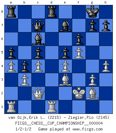 Last move : 1/2-1/2 2021 November 26 8:55:29 [Event "FICGS__CHESS__CUP_CHAMPIONSHIP__000004"] [Site "FICGS"] [Date "2021.09.20"] [Round "1"] [White "van Dijk,Erik L."] [Black "Ziegler,Pio"] [Result "1/2-1/2"] [WhiteElo "2215"] [BlackElo "2145"] 1.e4 c5 2.Nf3 d6 3.d4 cxd4 4.Nxd4 Nf6 5.Nc3 a6 6.g3 e5 7.Nb3 Be7 8.Bg2 O-O 9.O-O b5 10.a4 b4 11.Nd5 Nxd5 12.Qxd5 Ra7 13.Be3 Be6 14.Qd3 Ra8 15.f4 a5 16.Rfc1 f6 17.f5 Bf7 18.c3 Na6 19.c4 Qc7 20.h4 Rfd8 21.Kf2 Nc5 22.Qc2 Be8 23.Nxc5 dxc5 24.b3 Bc6 25.Rd1 1/2-1/2 Sicilian : Najdorf, Zagreb (Fianchetto) variation Kingside Castling by player Black (move 8) Kingside Castling by player White (move 9) This chess game ended in a draw. Follow this game move after move (download)Chess is a fighting game which is purely intellectual and includes chance. (Richard Reti) Ich glaube nicht an Psychologie, ich glaube an gute Züge. (Robert James Fischer) Cuando no sepas que mover, espera por una idea que se le venga a la la cabeza de tu oponente. Tenlo por seguro de que esa idea estará incorrecta. (Siegbert Tarrasch) La solitude du joueur d'Echecs à l'approche du mat est semblable à celle du condamné. (Francis Szpiner) Life is pain my dear and anyone who says otherwise is selling something. (Princess Bride)