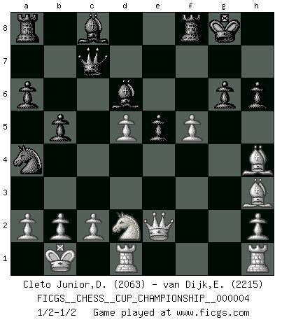 Last move : 1/2-1/2 2021 December 11 2:2:39 [Event "FICGS__CHESS__CUP_CHAMPIONSHIP__000004"] [Site "FICGS"] [Date "2021.09.20"] [Round "1"] [White "Cleto Junior,Dirceu"] [Black "van Dijk,Erik L."] [Result "1/2-1/2"] [WhiteElo "2063"] [BlackElo "2215"] 1.e4 c5 2.Nf3 d6 3.d4 cxd4 4.Nxd4 Nf6 5.Nc3 a6 6.Bg5 Nbd7 7.Qe2 h6 8.Bh4 g6 9.f4 e5 10.fxe5 dxe5 11.O-O-O Qc7 12.Nb3 b5 13.Nd5 Nxd5 14.exd5 Bd6 15.Nd2 Nc5 16.Kb1 O-O 17.g4 f5 18.Bh3 Na4 19.gxf5 1/2-1/2 Sicilian : Najdorf, 6.Bg5 Queenside Castling by player White (move 11) Kingside Castling by player Black (move 16) This chess game ended in a draw. Follow this game move after move (download)We don't really know how the game was invented, though there are suspicions. As soon as we discover the culprits, we'll let you know. (Bruce Pandolfini) Alle offensichtlichen Züge sehen nach dem Spiel in der Analyse verdächtig aus. (Viktor Kortschnoi) Combinaciones deslumbrantes son para la mayoría, mover madera es para los pocos. (Georg Kieninger) Les échecs c'est le défi de l'alpiniste, toujours plus haut, prêt à tout pour monter à l'assaut du Roi ennemi. Les échecs, c'est de la musique en mouvement, un ballet majestueux pour les yeux. C'est de la poésie composée par les fantômes du passé qui au même titre que Rimbaud ou Verlaine méritent notre admiration. Les échecs, c'est de la peinture ou le moindre mouvement modifie le tableau pour en faire un Picasso ou un Van Gogh. Les échecs, c'est tout et rien, c'est la vie et la mort. Jjulie33 sur le forum de France-Echecs. Computers have lots of memory but no imagination. (Anonymous)