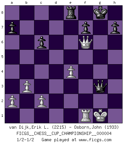 Last move : 1/2-1/2 2021 December 6 9:42:48 [Event "FICGS__CHESS__CUP_CHAMPIONSHIP__000004"] [Site "FICGS"] [Date "2021.09.20"] [Round "1"] [White "van Dijk,Erik L."] [Black "Osborn,John"] [Result "1/2-1/2"] [WhiteElo "2215"] [BlackElo "1933"] 1.e4 e5 2.Nc3 Nf6 3.g3 Bc5 4.Bg2 O-O 5.Nge2 c6 6.O-O d5 7.exd5 cxd5 8.d4 exd4 9.Nxd4 Bg4 10.Qd3 Bxd4 11.Qxd4 Nc6 12.Qc5 d4 13.h3 Be6 14.Bxc6 Bxh3 15.Rd1 bxc6 16.Rxd4 Qc8 17.f3 Nd7 18.Qh5 Be6 19.b3 Re8 20.Bb2 Nf6 21.Qg5 Bf5 22.Rf4 Bg6 23.Rxf6 gxf6 24.Qh4 Qc7 25.Ne4 Bxe4 26.fxe4 Re6 27.Bxf6 Rxf6 28.Qxf6 Qxg3+ 29.Kh1 Qh3+ 30.Kg1 Qg3+ 31.Kh1 Qh3+ 32.Kg1 Re8 33.Rf1 Qg3+ 34.Kh1 Qh3+ 35.Kg1 Qg3+ 36.Kh1 Qh3+ 37.Kg1 Qg3+ 1/2-1/2 Vienna : Paulsen-Mieses variation Kingside Castling by player Black (move 4) Kingside Castling by player White (move 6) This chess game ended in a draw. Follow this game move after move (download)We cannot resist the fascination of sacrifice, since a passion for sacrifices is part of a Chessplayer's nature. (Rudolf Spielman) Im Blitz ist es einfacher mit einer Figur weniger anzugreifen, als sich mit einer Mehrfigur zu verteidigen. (Mikhail Nekhemyevich Tal) Si pudieramos observar el interior de la cabeza de un jugador de Ajedrez, encontraríamos ahí un mundo lleno de sentimientos, imágenes, ideas, emoción y pasión. (Alfred Binet) Les échecs sont un jeu par leur forme, un art par leur essence et une science par sa difficulté d'acquisition. Ils peuvent vous procurer autant de plaisir qu'un bon livre ou une belle musique, mais vous n'aurez une réelle joie que si vous arrivez à bien jouer. (Tigran Petrosian) A married woman is like a fish riding a bicycle. (Rodolfo d'Ettorre)