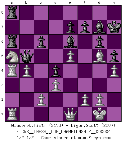 Last move : 1/2-1/2 2021 October 29 13:13:12 [Event "FICGS__CHESS__CUP_CHAMPIONSHIP__000004"] [Site "FICGS"] [Date "2021.09.20"] [Round "1"] [White "Wiaderek,Piotr"] [Black "Ligon,Scott"] [Result "1/2-1/2"] [WhiteElo "2193"] [BlackElo "2207"] 1.e4 c5 2.Nf3 Nc6 3.Bb5 g6 4.Bxc6 dxc6 5.d3 Bg7 6.h3 b6 7.a4 a5 8.e5 Nh6 9.O-O O-O 10.Re1 Nf5 11.Na3 Nd4 12.Nxd4 cxd4 13.b3 Be6 14.Bf4 Ra7 15.Qd2 Qd5 16.Nc4 b5 17.Nxa5 Rfa8 18.b4 bxa4 19.Rxa4 Qb5 20.Rea1 h5 21.Qe1 Kh7 22.h4 Ra6 23.Bg5 1/2-1/2 Sicilian : Nimzovich-Rossolimo attack (with ...g6, without ...d6) Kingside Castling by player White (move 9) Kingside Castling by player Black (move 9) This chess game ended in a draw. Follow this game move after move (download)Discovered check is the dive bomber of the Chessboard. (Reuben Fine) Meine Liebe ist Schach, Schach, Schach. Ich muss jeden Tag Schach spielen, deshalb fühle ich mich so stark. (Miguel Najdorf) Debemos de asegurarnos de que el Ajedrez no se convierta en un lenguaje muerto, muy interesante, pero solo para un grupo muy pequeño. (Sytze Faber) Vous savez, camarade Pachman, je n'éprouve pas de plaisir à être ministre, je jouerais plutôt aux échecs comme vous, ou alors ferais une révolution au Venezuela. (Che Guevara à Ludek Pachman, 'Checkmate in Prague', 1975) The Internet isn't free. It just has an economy that makes no sense to capitalism. (Brad Shapcott)