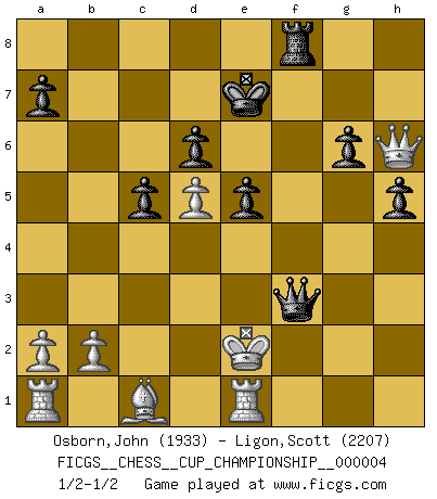 Last move : 1/2-1/2 2021 September 27 16:24:24 [Event "FICGS__CHESS__CUP_CHAMPIONSHIP__000004"] [Site "FICGS"] [Date "2021.09.20"] [Round "1"] [White "Osborn,John"] [Black "Ligon,Scott"] [Result "1/2-1/2"] [WhiteElo "1933"] [BlackElo "2207"] 1.e4 c5 2.Nf3 Nc6 3.Bb5 g6 4.O-O Bg7 5.Bxc6 bxc6 6.Re1 Nh6 7.h3 d6 8.c3 f5 9.d4 cxd4 10.exf5 Nxf5 11.g4 O-O 12.gxf5 Qd7 13.Nxd4 c5 14.Ne6 Rxf5 15.Nxg7 Kxg7 16.Qg4 Bb7 17.c4 e5 18.Nc3 Raf8 19.Nd5 h5 20.Qg2 Bxd5 21.cxd5 Rxf2 22.Qg5 Qxh3 23.Qh6+ Kf7 24.Kxf2 Ke7 25.Ke2 Qf3+ 1/2-1/2 Sicilian : Nimzovich-Rossolimo attack (with ...g6, without ...d6) Kingside Castling by player White (move 4) Kingside Castling by player Black (move 11) This chess game ended in a draw. Follow this game move after move (download)Chess is mental torture. (Garry Kasparov) Das Schachspiel ist ein See, in welchem eine Mücke baden und ein Elefant ertrinken kann. (Emanuel Lasker) Observen a Garry Kasparov. Después de una derrota, invariablemente el gana la próxima partida. Prácticamente hace pedazos a su siguiente oponente. Eso es algo que tenemos que aprender a lograr. (Maurice Ashley) Il n'y a pas eu de défaite parce que je ne crois pas que cet ordinateur ait jamais existé. IBM a triché en refusant d'imprimer les modes de recherche de la machine. C'est évident, pendant le match, des coups décisifs ont été joués par des êtres humains. Aujourd'hui, les meilleurs spécialistes en informatique ne peuvent toujours pas expliquer comment Deep-Blue a pu jouer contre la logique des ordinateurs. IBM a gagné une guerre de communication, mais ils sont incapables de prouver que l'ordinateur a gagné tout seul. (Garry Kasparov) The smarter you play, the luckier you'll be. (Mark Pilarski)
