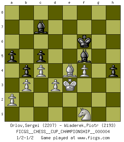 Last move : 1/2-1/2 2021 November 11 4:11:19 [Event "FICGS__CHESS__CUP_CHAMPIONSHIP__000004"] [Site "FICGS"] [Date "2021.09.20"] [Round "1"] [White "Orlov,Vladimir"] [Black "Wiaderek,Piotr"] [Result "1/2-1/2"] [WhiteElo "2207"] [BlackElo "2193"] 1.e4 e5 2.Nf3 Nc6 3.Bb5 a6 4.Ba4 Nf6 5.O-O Be7 6.Re1 b5 7.Bb3 O-O 8.c3 d5 9.exd5 Nxd5 10.Nxe5 Nxe5 11.Rxe5 c6 12.d3 Bd6 13.Re1 Bf5 14.Qf3 Re8 15.Rxe8+ Qxe8 16.Nd2 Qe1+ 17.Nf1 Bg6 18.g3 b4 19.c4 Nc7 20.Bd1 c5 21.Qe2 Re8 22.Be3 Qxe2 23.Bxe2 Be5 24.Rb1 Bd4 25.b3 Ne6 26.Rd1 Rd8 27.h4 h5 28.Bf3 Bc3 29.Bd5 Bf5 30.Kg2 a5 31.Bg5 Nxg5 32.hxg5 g6 33.Ne3 Bd7 34.Be4 Kg7 35.Nd5 Bd4 36.Nc7 Rb8 37.Re1 Bc3 38.Re2 Bd4 39.Bf3 Kf8 40.Nd5 Re8 41.Rxe8+ Bxe8 42.Nb6 f6 43.gxf6 Kf7 44.Be4 g5 45.f4 gxf4 46.gxf4 Bxf6 47.Nd5 Bd7 48.Nb6 Ke6 49.Bf3 Be8 50.Nd5 Bd8 51.Ne3 Bc7 52.Bd5+ Kf6 53.Kf3 Bd7 54.Nf1 Bg4+ 55.Ke4 Bf5+ 56.Ke3 h4 57.Be4 1/2-1/2 Ruy Lopez : Closed, 7...O-O Kingside Castling by player White (move 5) Kingside Castling by player Black (move 7) This chess game ended in a draw. Follow this game move after move (download)In the perfect Chess combination as in a first-rate short story, the whole plot and counter-plot should lead up to a striking finale, the interest not being allayed until the very last moment. (Yates and Winter) Ich verstehe den Grund nicht, warum die Aufteilung in Frauen und Männer überhaupt im Schach besteht. (Judith Polgar) Cuando no sepas que mover, espera por una idea que se le venga a la la cabeza de tu oponente. Tenlo por seguro de que esa idea estará incorrecta. (Siegbert Tarrasch) Nous vivons dans un monde échiquéen : chaque jour qui passe est un défi à relever. (Philosophe Sasha) Art is the triumph over chaos. (John Cheever)