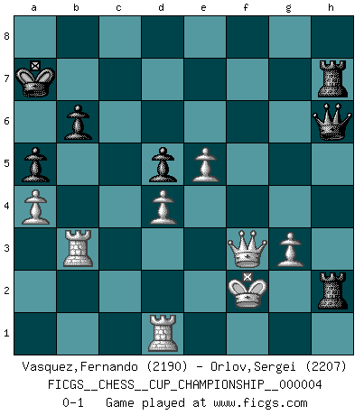 Last move : 0-1 2022 January 23 3:51:1 [Event "FICGS__CHESS__CUP_CHAMPIONSHIP__000004"] [Site "FICGS"] [Date "2021.09.20"] [Round "1"] [White "Vasquez,Fernando"] [Black "Orlov,Vladimir"] [Result "0-1"] [WhiteElo "2190"] [BlackElo "2207"] 1.e4 e6 2.d4 d5 3.e5 c5 4.c3 Nc6 5.Nf3 Qb6 6.a3 c4 7.Nbd2 Na5 8.Be2 Bd7 9.Rb1 Ne7 10.b4 cxb3 11.Nxb3 Nxb3 12.Rxb3 Qc7 13.O-O Ba4 14.Bb5+ Bxb5 15.Rxb5 a6 16.Rb1 Nc6 17.Re1 Be7 18.Re3 h5 19.Rd3 O-O-O 20.Bg5 h4 21.Bxe7 Qxe7 22.h3 Na5 23.Qa4 Qc7 24.Ng5 Rd7 25.Qd1 Nc4 26.a4 Kb8 27.Rb4 Qd8 28.Nf3 Ka7 29.Nd2 Nxd2 30.Rxd2 Qc7 31.Rb3 Rc8 32.Qb1 g6 33.Ra2 b6 34.Rab2 Rb8 35.Kh1 Qc6 36.Ra2 Rdb7 37.Qf1 Qe8 38.Qc1 Rc8 39.Qa1 Rc4 40.Kg1 Rbc7 41.Qb2 Qc6 42.R2a3 a5 43.Qa1 Qe8 44.Qb2 R7c6 45.Qd2 Ka6 46.g4 hxg3 47.fxg3 Rc7 48.Qa2 Ka7 49.Qb2 Rb7 50.Rb5 g5 51.Kg2 Qc6 52.Kh2 Rb8 53.Kg1 Rc8 54.R5b3 Rh8 55.Qf2 Rxh3 56.Qxf7+ Ka6 57.Qf3 Qe8 58.Rb1 Ka7 59.Rab3 g4 60.Qxg4 Qh8 61.Qf3 Rc7 62.c4 Qh6 63.cxd5 Rh7 64.Qf4 Qh5 65.Qf3 Qh6 66.Qf4 Qg6 67.Qf3 exd5 68.Re1 Qh6 69.Rd1 Rh1+ 70.Kf2 Rh2+ 0-1 French : Advance, Paulsen attack Kingside Castling by player White (move 13) Queenside Castling by player Black (move 19) Player Black won this chess game. Follow this game move after move (download)Chess, like love, like music, has the power to make people happy. (Siegbert Tarrasch) Ich kenne Menschen, die allen Willen der Welt besitzen und doch nicht Schach spielen können. (Robert James Fischer) Morphy probablemente fue el genio más grande de todos. (Bobby Fischer) L'attaque fait le spectacle, la défense gagne les matchs. (Dicton footballistique) I've lost money so fast in these clubs it's left me reeling. I've read every poker book ever written, but the only way to get better at the game is to go out and play with people who are really good. The problem is, you stand to lose a lot of money doing it. (Matt Damon)