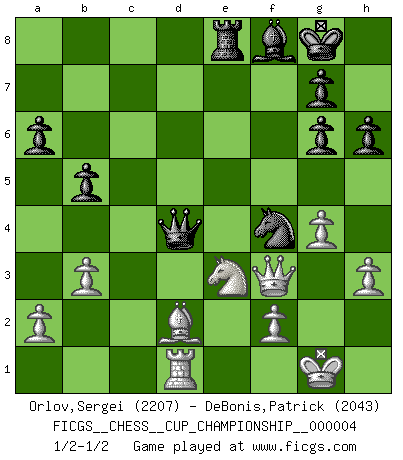 Last move : 1/2-1/2 2021 October 30 8:25:52 [Event "FICGS__CHESS__CUP_CHAMPIONSHIP__000004"] [Site "FICGS"] [Date "2021.09.20"] [Round "1"] [White "Orlov,Vladimir"] [Black "DeBonis,Patrick"] [Result "1/2-1/2"] [WhiteElo "2207"] [BlackElo "2043"] 1.e4 e5 2.Nf3 Nc6 3.Bb5 a6 4.Ba4 Nf6 5.O-O Be7 6.Re1 b5 7.Bb3 O-O 8.c3 d5 9.exd5 Nxd5 10.Nxe5 Nxe5 11.Rxe5 c6 12.d3 Bd6 13.Re1 Bf5 14.Qf3 Re8 15.Rxe8+ Qxe8 16.Nd2 Qe1+ 17.Nf1 Bg6 18.g3 Re8 19.Bd1 Qe6 20.Bd2 Qd7 21.Bc2 Nf6 22.Rc1 Bh5 23.Qg2 c5 24.h3 h6 25.d4 cxd4 26.cxd4 Bf8 27.g4 Bg6 28.Bxg6 fxg6 29.Qc6 Qf7 30.b3 Nd5 31.Ne3 Nf4 32.Qf3 Qf6 33.Rd1 Qxd4 1/2-1/2 Ruy Lopez : Closed, 7...O-O Kingside Castling by player White (move 5) Kingside Castling by player Black (move 7) This chess game ended in a draw. Follow this game move after move (download)If a ruler does not understand Chess, how can he rule over a kingdom ? (King Khusros II) Wie kann ich Remis annehmen? Ich weiß ja gar nicht, wie ich stehe! (Fritz Sämisch) Haz el enroque temprano y seguido. (Rob Sillars) Le temps de noter son nom sur la feuille de partie, j'étais déjà en zeitnot ! D'un modeste amateur apparié lors de la première ronde d'un open contre le grand-maître Azmaïparashvili. I don't diet. I just don't eat as much as I'd like to. (Linda Evangelista, supermodel)