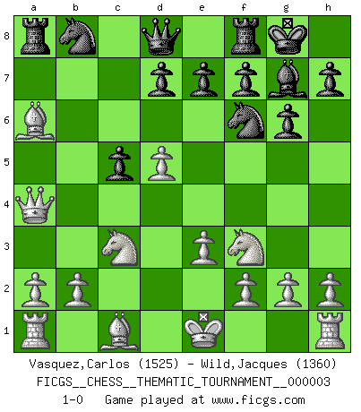Last move : 1-0 2006 August 23 6:32:3 [Event "FICGS__CHESS__THEMATIC_TOURNAMENT__000003"] [Site "FICGS"] [Date "2006.06.24"] [Round "1"] [White "Vasquez,Carlos"] [Black "Wild,Jacques"] [Result "1-0"] [WhiteElo "1525"] [BlackElo "1360"] 1.d4 Nf6 2.c4 c5 3.d5 b5 4.e3 g6 5.cxb5 a6 6.Nc3 axb5 7.Bxb5 Ba6 8.Qa4 Bg7 9.Nf3 O-O 10.Bxa6 1-0 This chess game has been lost on time (started : 2006.06.24 13:30:12) Benko gambit Kingside Castling by player Black (move 9) Player White won this chess game. Follow this game move after move (download)The tactician must know what to do whenever something needs doing; the strategist must know what to do when nothing needs doing. (Savielly Tartakover) Schach ist wie eine schöne Frau, zu der wir ständig zurückkehren, gleichviel, wie oft sie uns zurückweist. (Anonymous) Un juego de Ajedrez es un dialogo, una conversación entre un jugador y su oponente. Cada movimiento del oponente puede contener amenazas o tropiezos, pero un jugador no se puede defender de las amenazas o tomar ventaja de los tropiezos si es que no se pregunta a sí mismo: ¿Que es lo que mi oponente va a hacer después de cada movida?. (Bruce A. Moon) Les Echecs mettent en conflit, non pas deux intelligences, mais deux volontés. (Lasker) Memory is a complicated thing, a relative to truth, but not its twin. (Barbara Kingsolver, Animal Dreams)